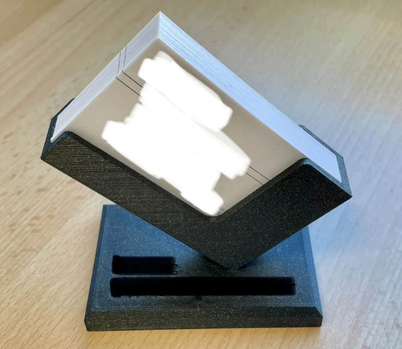 Giá đỡ danh thiếp hiện đại nghiêng 45° để trưng bày phong cách các danh thiếp của bạn. Giá đỡ này có thể chứa các thẻ với bất kỳ kích thước nào. Các thẻ theo định dạng 85x55mm nằm phẳng với bên ngoài của giá đỡ. Chồng thẻ có thể dày tới 15mm. Tôi đã chỉnh sửa mô hình này từ Titafubaki và thêm một đường cắt ở dưới cùng nơi mà cạnh của các thẻ đi qua. Điều này cho phép ngay cả các thẻ hình chữ nhật cũng nằm phẳng ở các cạnh và các góc không bị cong. In ấn Nếu máy in của bạn có thể xử lý các phần nhô ra 45°, mô hình này có thể được in mà không cần hỗ trợ. Máy in Ender 3 V2 Neo của tôi, mà gặp chút khó khăn với các phần nhô ra dốc, đã in rất sạch sẽ (xem hình). Hãy đảm bảo rằng “Đảm bảo độ dày vỏ đứng” được bật trên phiên bản Pruce Slicer trước 2.6 (đây là mặc định, không thể chuyển đổi sau đó), để bạn có được các bề mặt nghiêng đẹp. Tôi đã sử dụng các tham số máy in sau: - 2 đường viền, 20% độ đầy khối