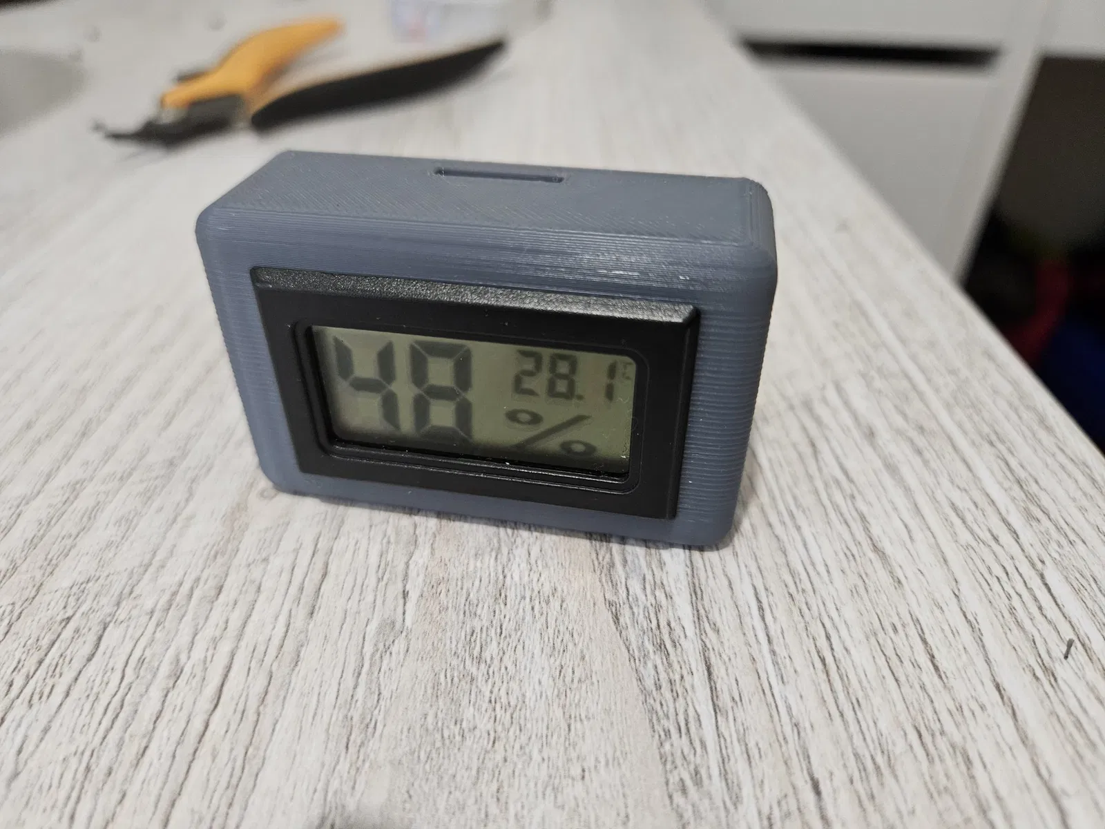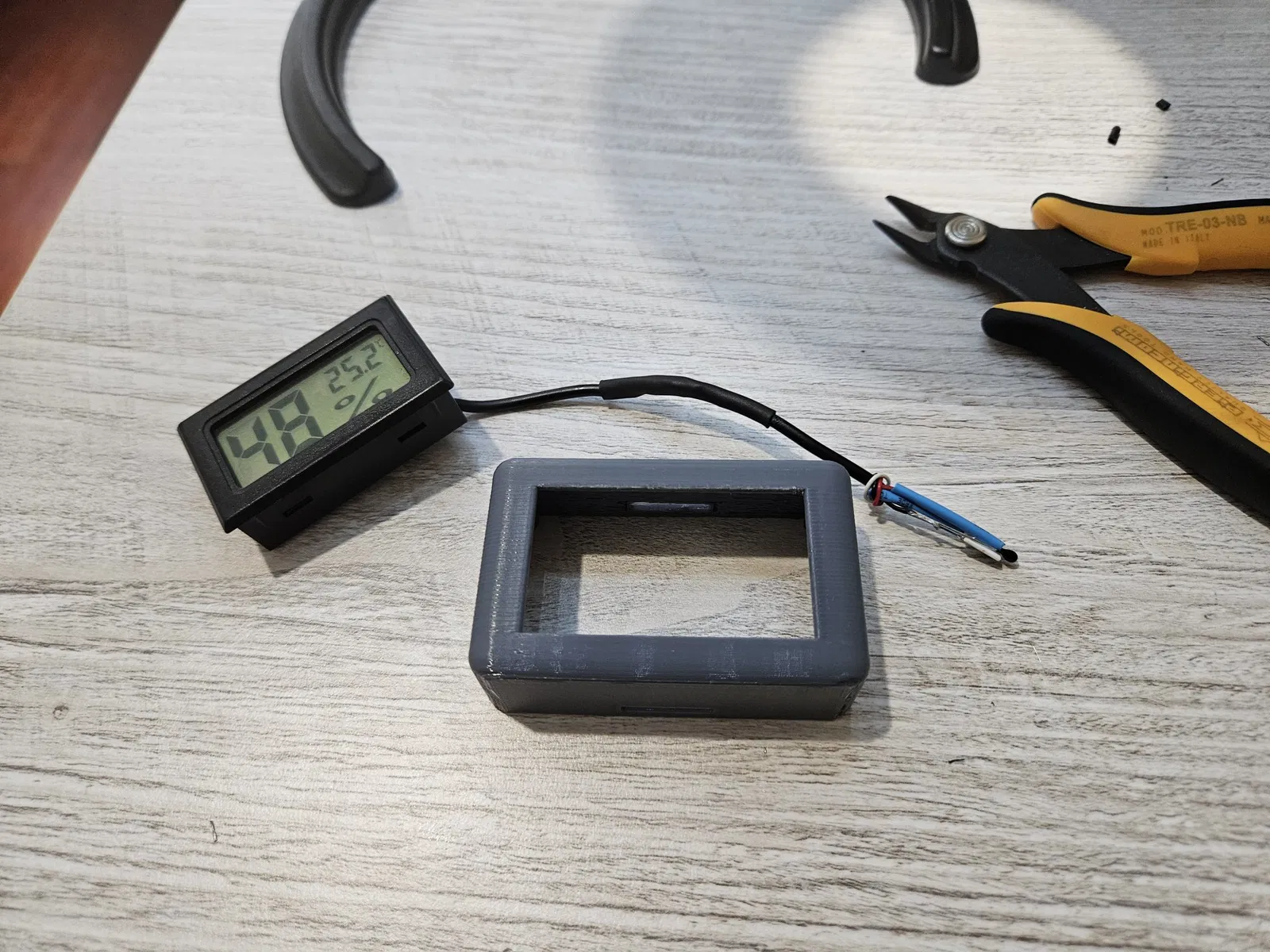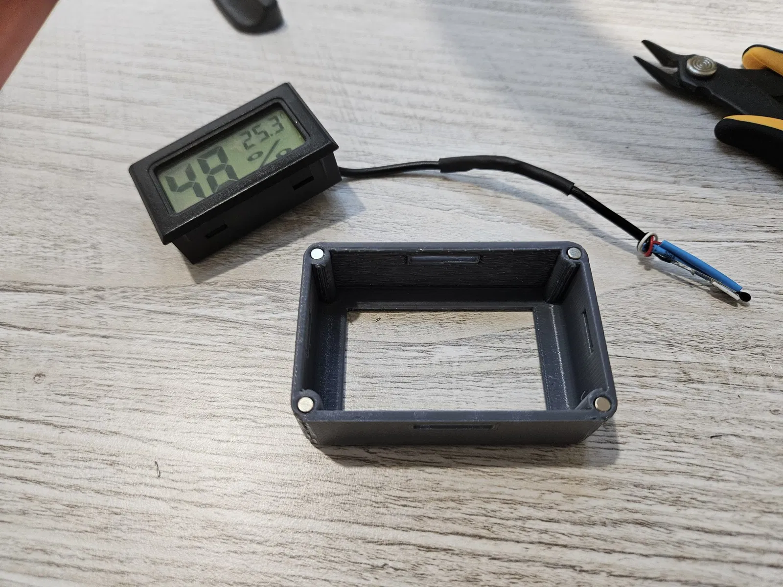 Tui có thiết kế một cái đế cho cảm biến nhiệt độ và độ ẩm, để cố định bộ cảm biến bên trong buồng máy in, sử dụng nam châm Neodymium. Phòng trường hợp cảm biến bị rớt ra trong lúc in. Tui không thể tưởng tượng được cảnh đó. Mà cũng không muốn dùng băng keo hai mặt vì nhiệt độ cao.