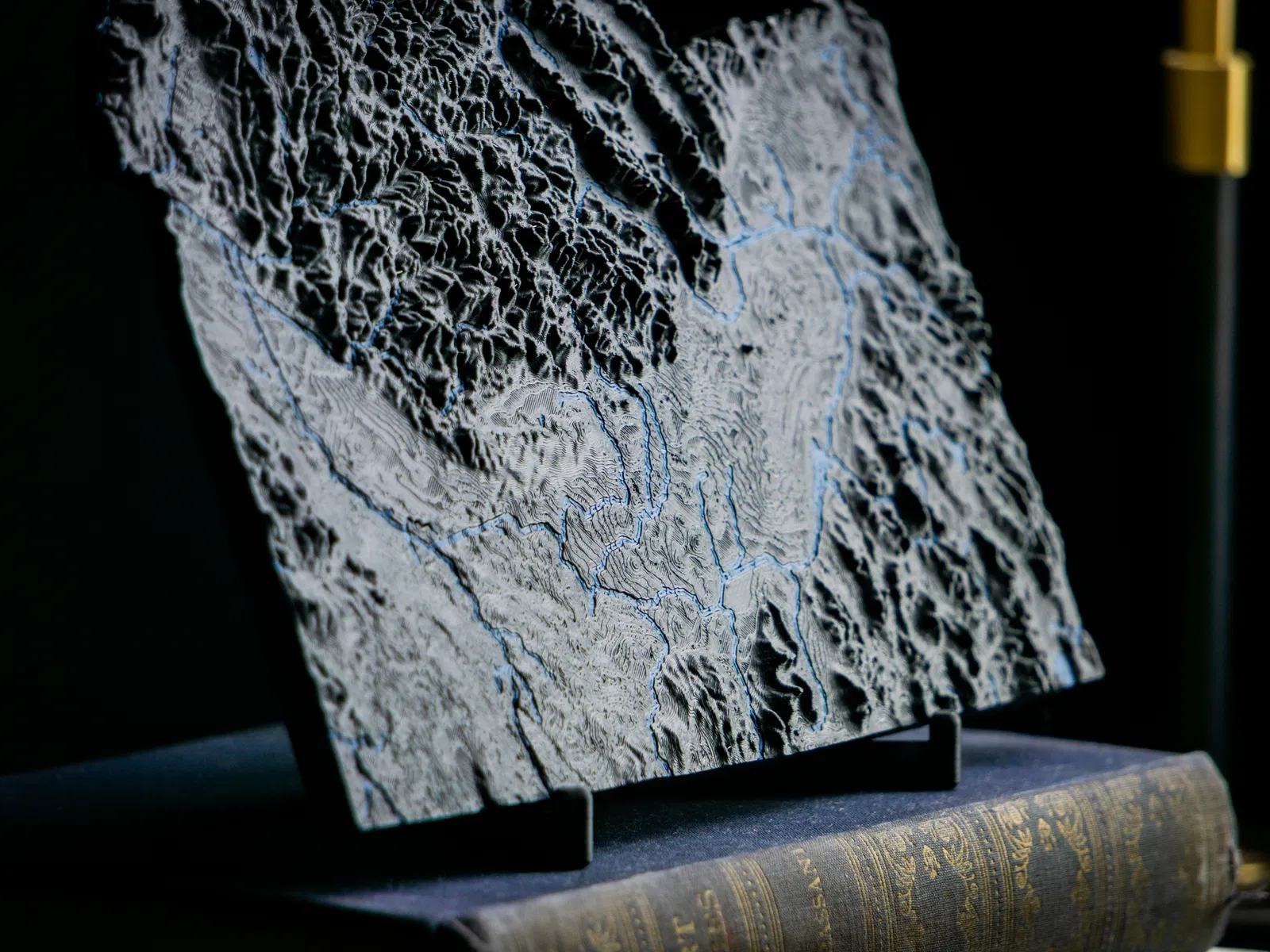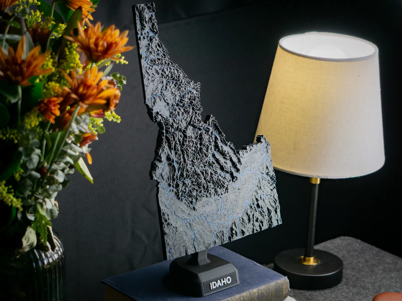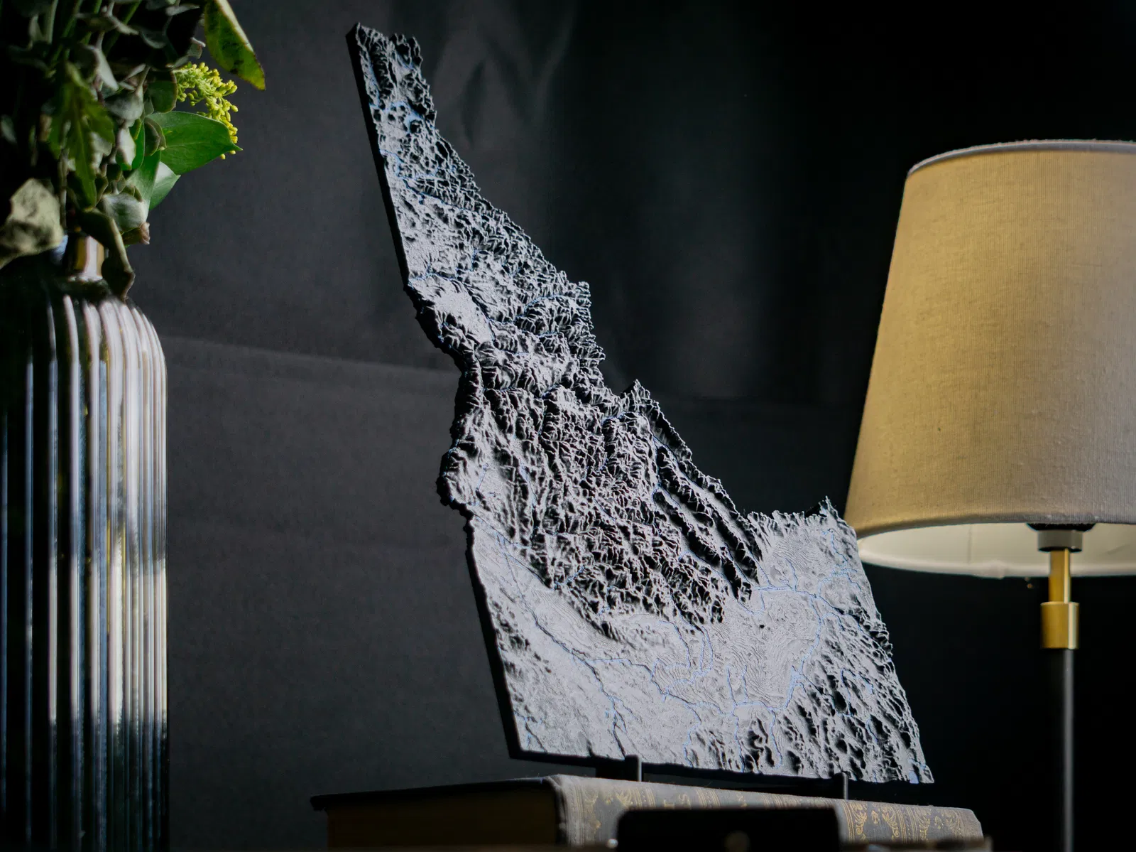 Mô hình núi, bờ biển, sông và hồ của Bang Idaho, Hoa Kỳ dưới dạng bản đồ địa hình và thủy văn hai màu hoặc đơn sắc! Tất cả các bang địa hình trong bộ sưu tập USA of Plastic đều có tỷ lệ 1:2500000 và lồng ghép vào nhau như một bộ ghép hình.