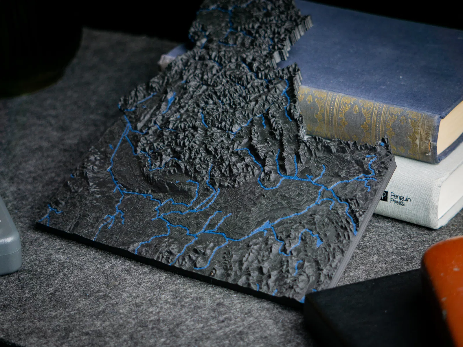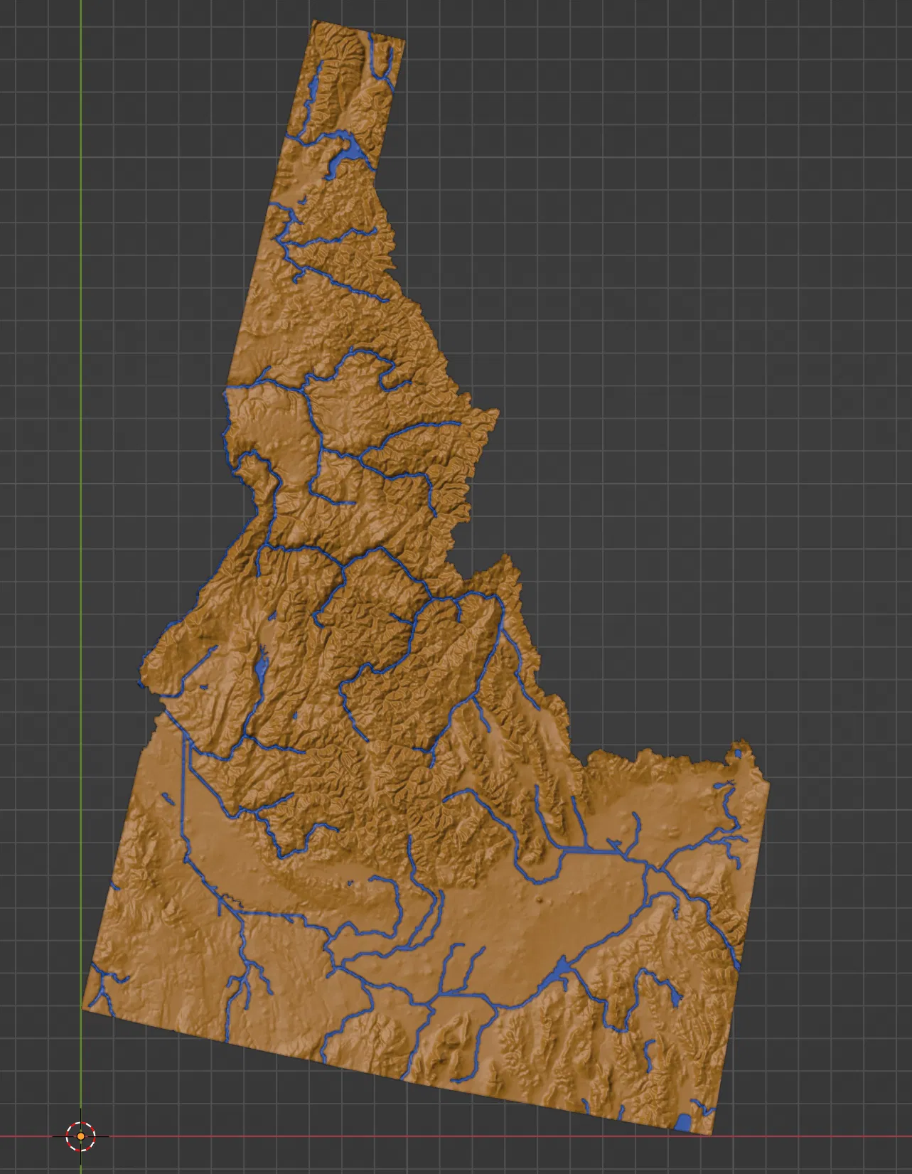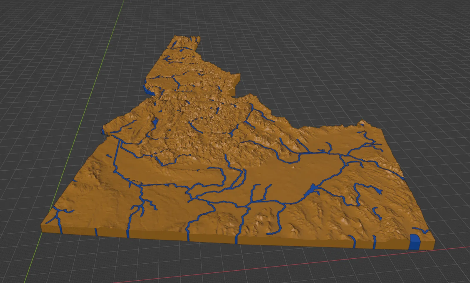 Mô hình bản đồ địa hình 2 màu của Idaho, Hoa Kỳ, bao gồm núi, sông và hồ. Tỷ lệ 1:2500000, các bang lồng ghép như ghép hình. Tải thêm bản đồ 3D in được và các tệp mô hình khuyến nghị.