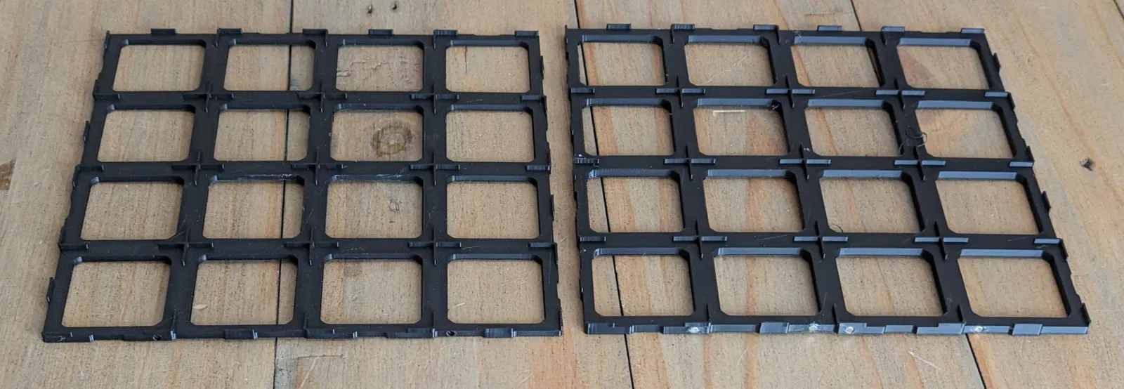 Nam châm được ép vào, nhưng nên dùng keo để đảm bảo nam châm không bị bung ra. Tùy thuộc vào mặt của lưới, một số lỗ có đường kính lớn hơn một chút và có thể bị bung ra khi sử dụng.