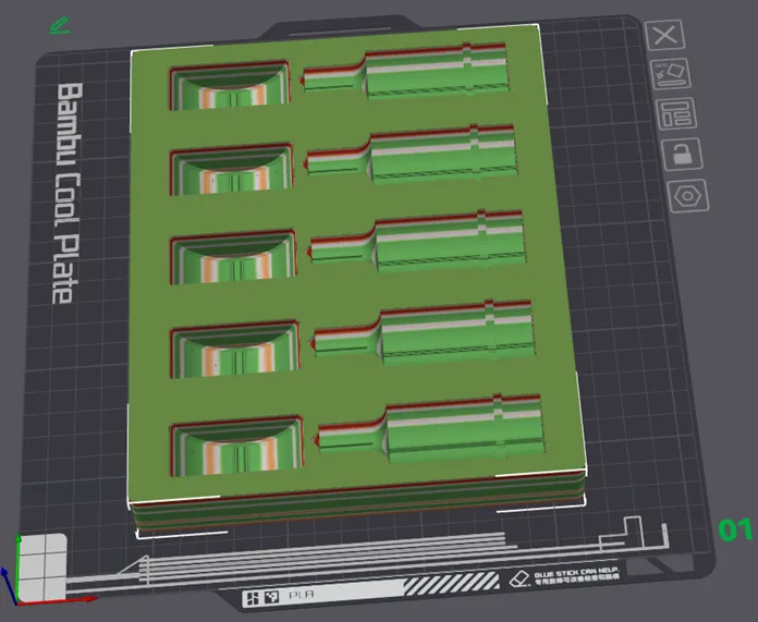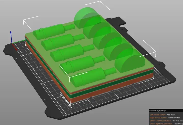 Tôi khuyên bạn nên in cái này với 5 hoặc nhiều lớp bao quanh (perimeters) và số lớp trên/dưới tương tự. Sau đó, bơm đầy theo kiểu con quay hồi chuyển (gyroscopic) 10% và bạn sẽ có một khay đựng dụng cụ khá chắc chắn để chứa bộ khuôn đấm và khuôn cắt MetalPro của bạn. Hình ảnh tôi đính kèm cho thấy độ cao lớp thay đổi (variable layer heights) mà tôi đã sử dụng để làm mịn phần đáy tròn của các lỗ nơi đặt dụng cụ. Tôi chỉ cần điều chỉnh độ cao lớp xuống mức nhỏ nhất ở đáy các đường cong và để thô ở những chỗ khác. Tôi chỉ đang cố gắng hoàn thành bản in càng sớm càng tốt nhưng vẫn đảm bảo chất lượng hình ảnh tương đối tốt.