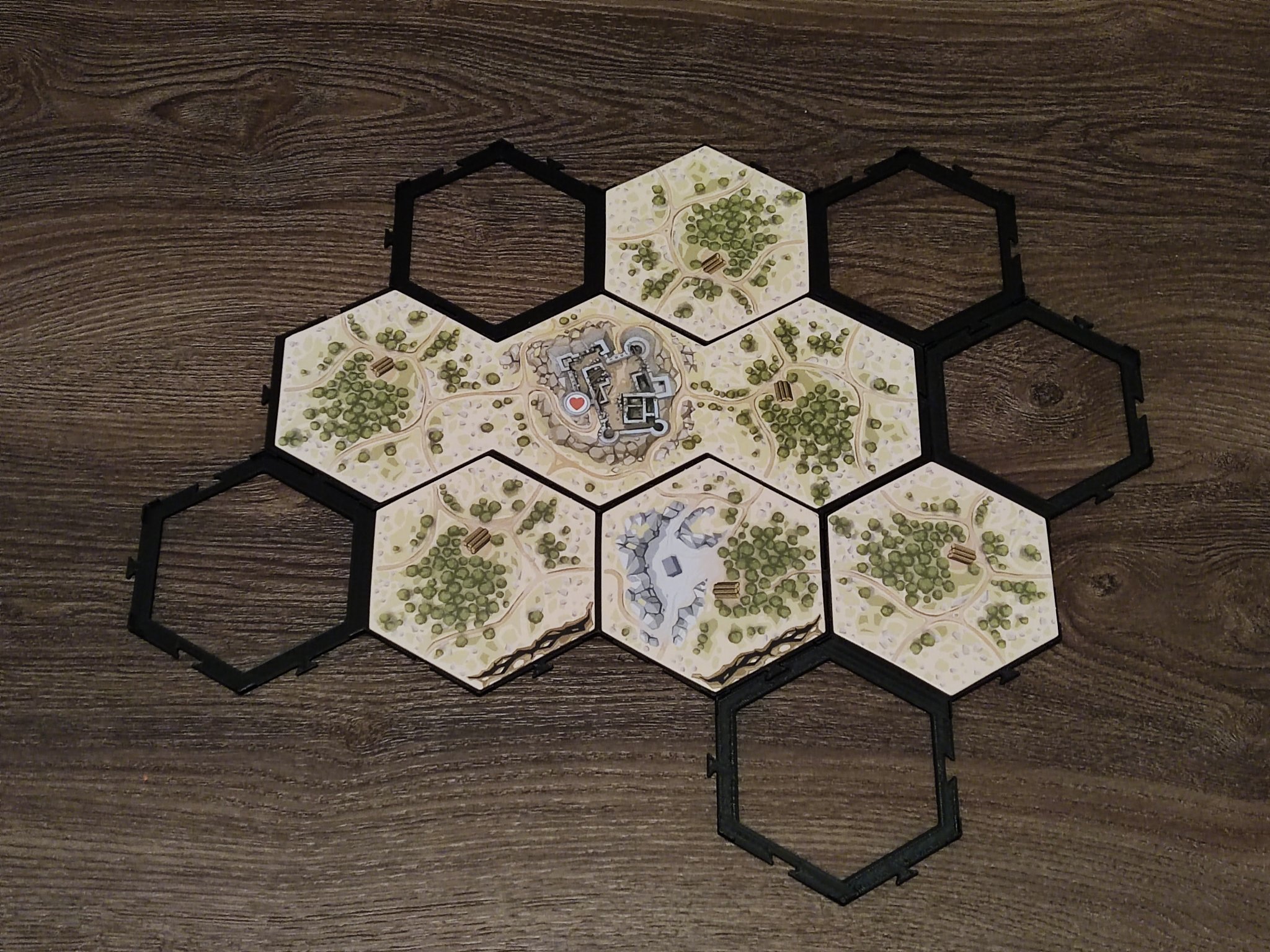 Tạo lưới lục giác cho 3 ô bản đồ trong game Karak 2. Bạn cần 1 ô "start" và ít nhất 10 ô thường cho game cơ bản, in với lớp 0.2mm và độ đặc 15%.