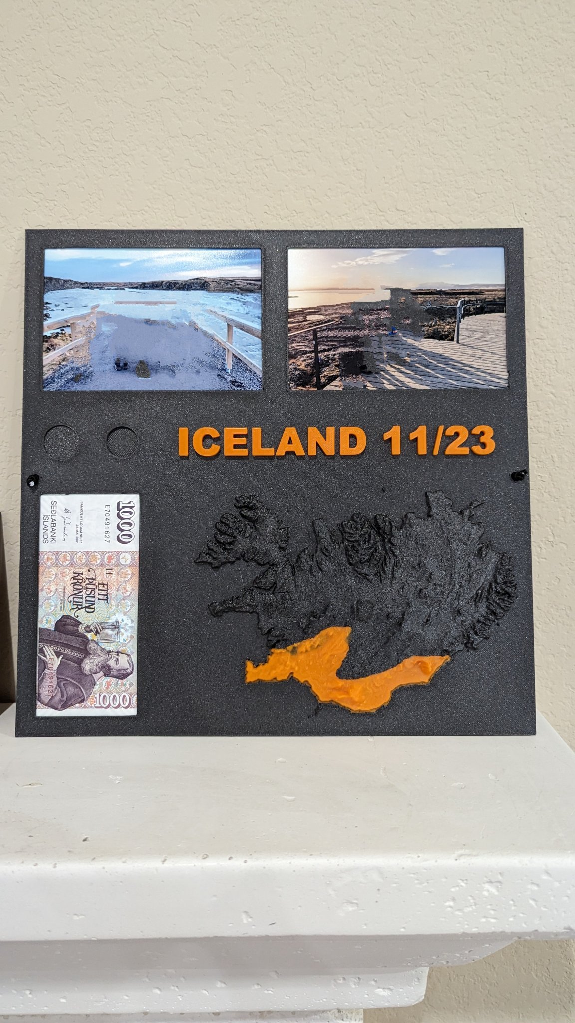 Tạo khung ảnh kỷ niệm chuyến đi Iceland, có thể thêm 2 ảnh 4x6 và một tờ 1000 ISK. Có khe đựng xu 100/50 ISK nhưng cần băng keo cố định. Khuyến khích dùng variable layer height, supports from base plate và raft khi in bằng PrusaSlicer.