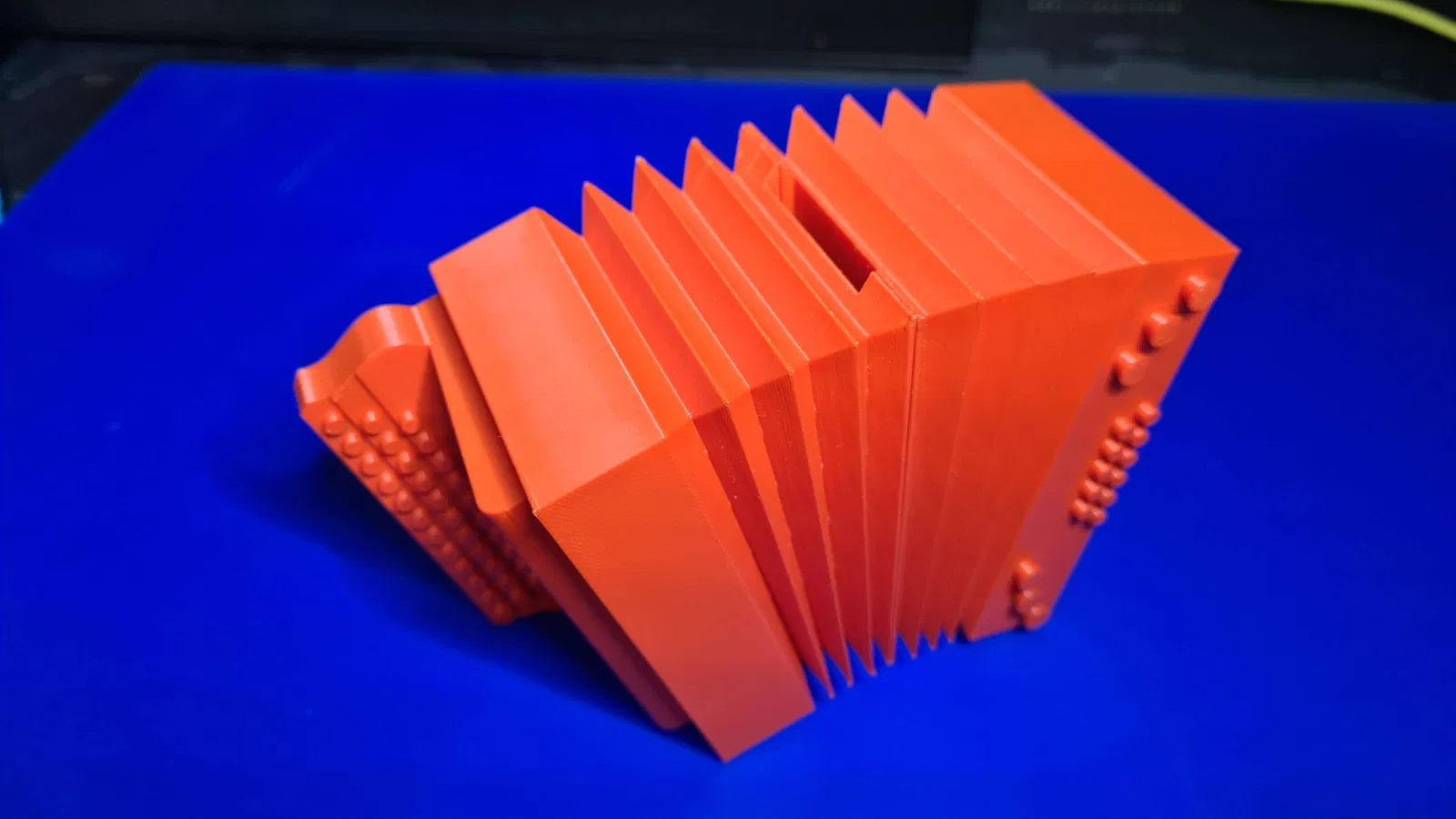 Heo đất 2 mảnh hình accordion, được giữ với nhau bằng 8 nam châm 6x3mm. Cần giá đỡ để in, đặc biệt là các bộ phận giữa có diện tích tiếp xúc nhỏ với bàn in, nên dùng brim để tránh cong vênh.