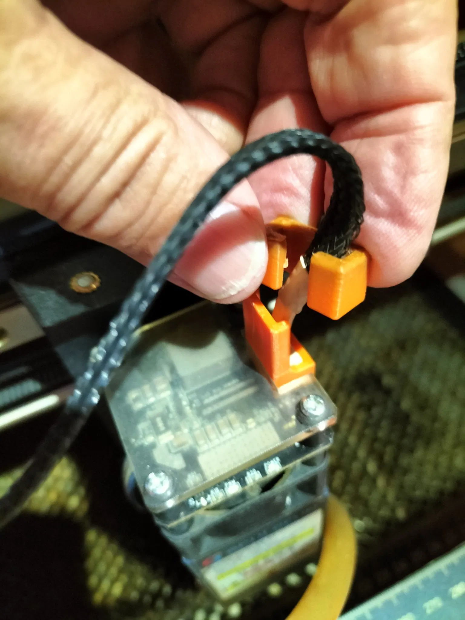 Cáp được luồn qua bộ phận hỗ trợ và sau đó cắm vào ổ cắm. Bây giờ, bộ phận hỗ trợ được trượt qua ổ cắm. Cuối cùng, kẹp được trượt vào từ phía trên. Bằng cách này, tải trọng uốn được loại bỏ khỏi đầu nối (ít nhất là tôi hy vọng vậy).