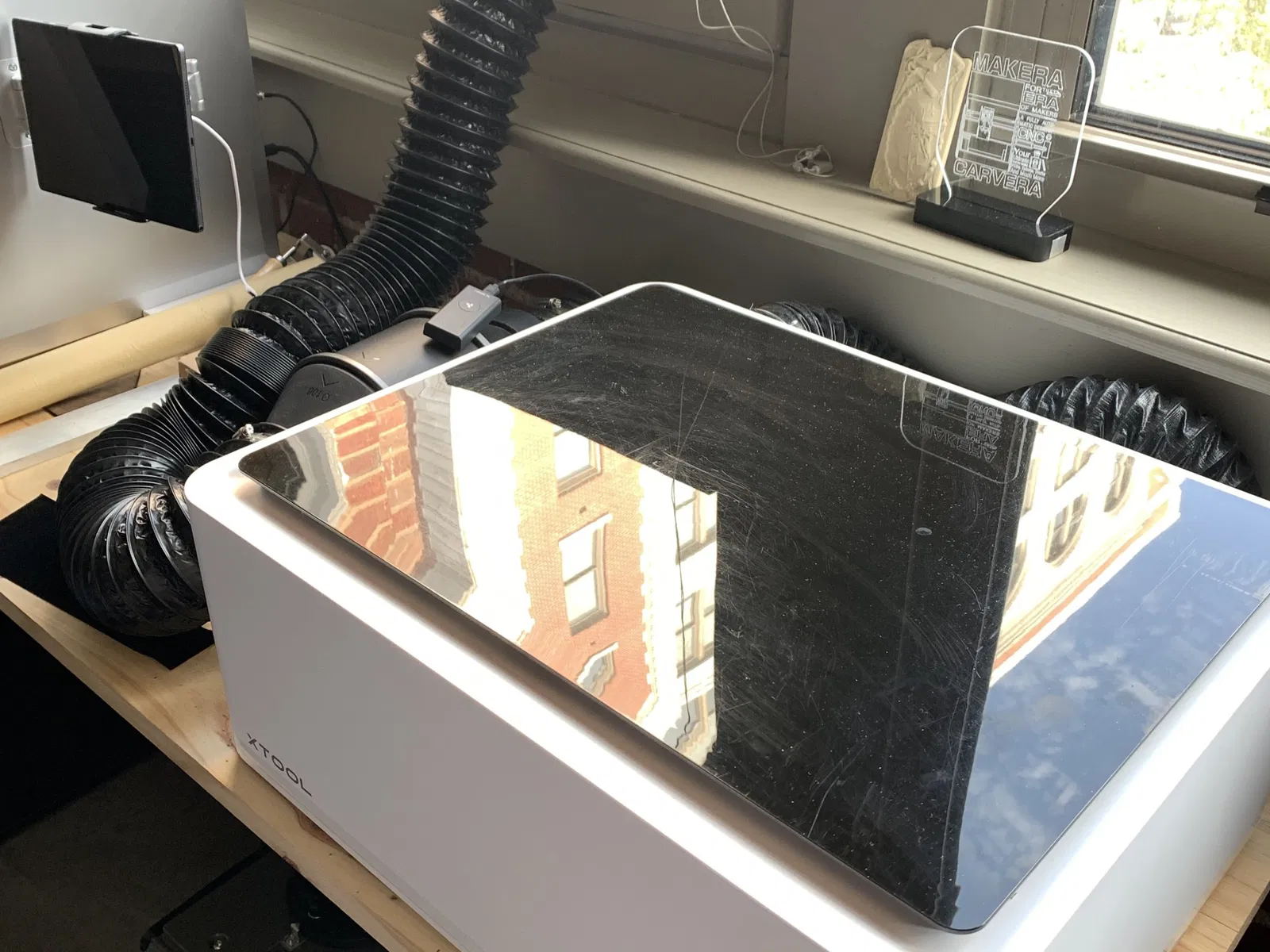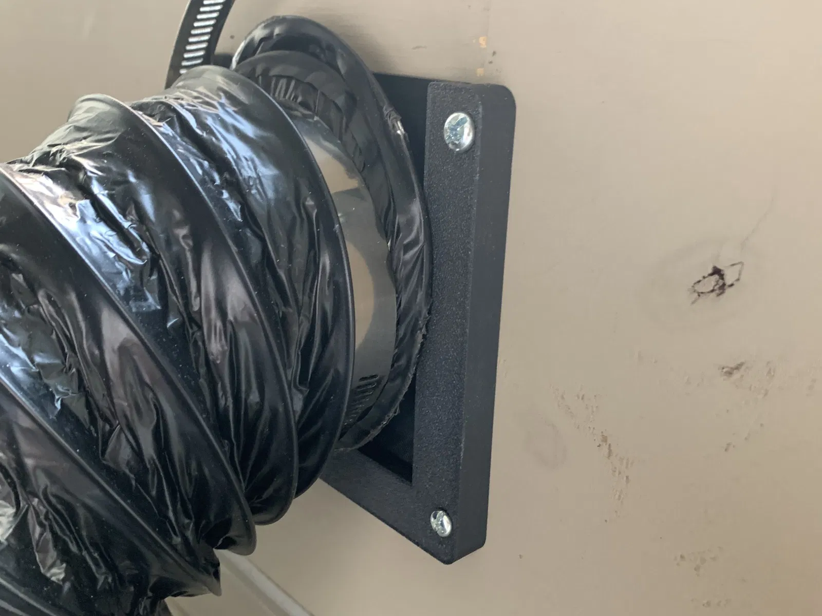 Van xả khí tháo rời với bộ chuyển đổi ống trượt cho ống 4", được sử dụng để xả khí cho máy khắc laser xTool M1 của tôi ra ngoài cửa sổ. Có thể tháo rời để lưu trữ trên bảng.