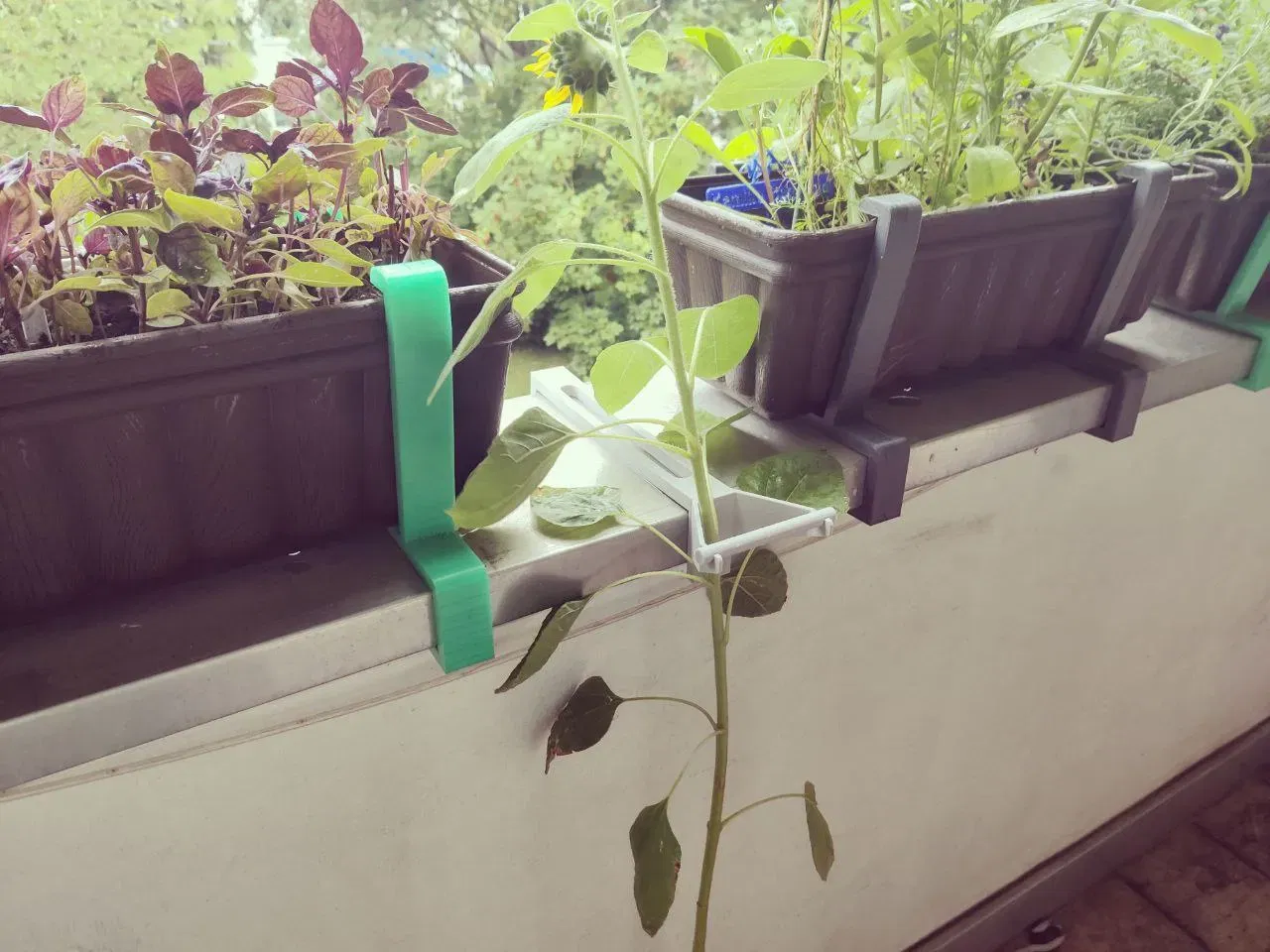 Tụi mình có trồng mấy cây hướng dương. Mấy cây này lớn nhanh lắm, mà cái chậu nhỏ nên thân cây không đủ cứng cáp để chống chọi với gió mạnh. Cái "hack" nhanh này giúp mình cố định cây hướng dương vào ban công mà không làm cây bị cấn nè, nên lỡ thân cây có lớn thêm thì cũng không bị dính vô cái đế.
