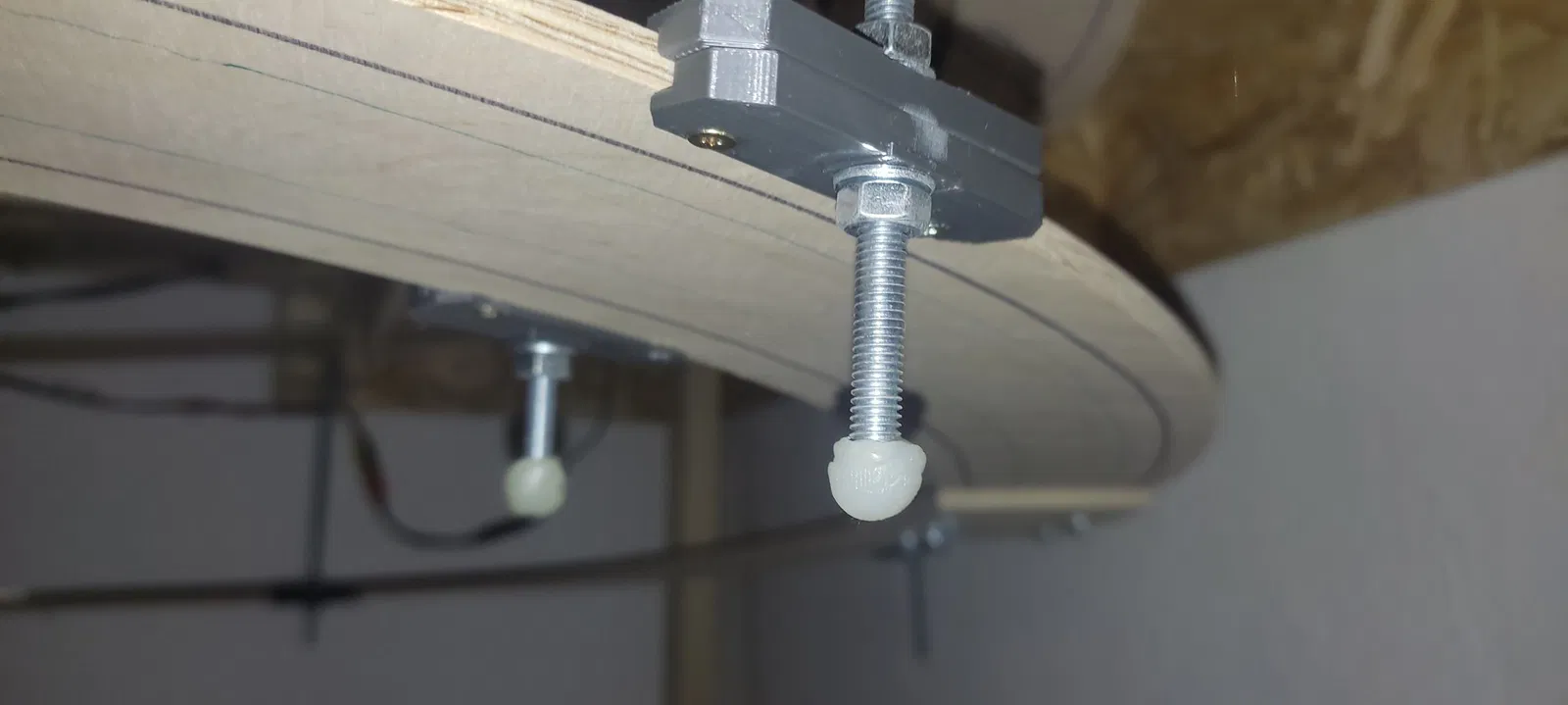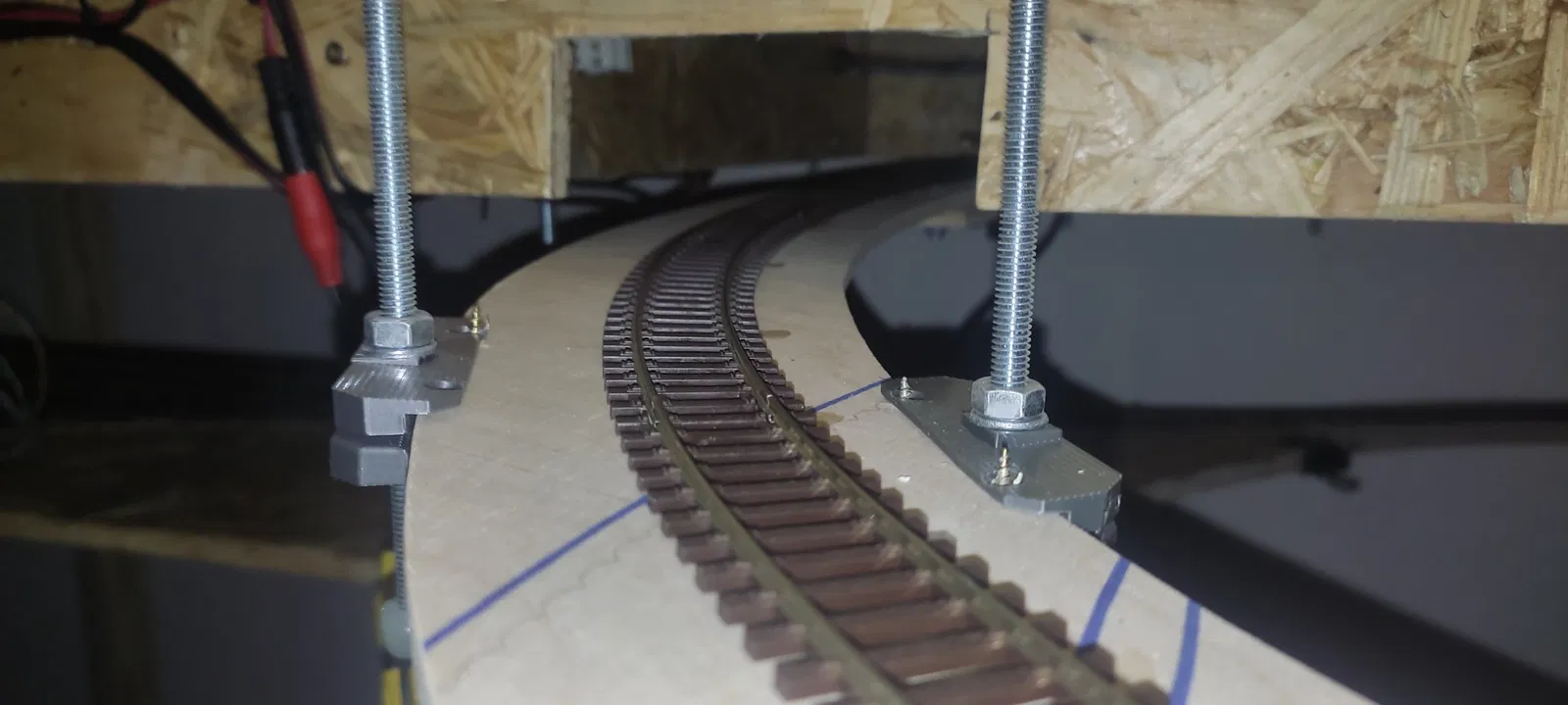 Držáky pro stavbu tobogánu modelové železnice z překližky 6mm a závitovou tyč M6, stoupání 2 stupně, použito pro H0 koleje R2 - R3 ROCO line.