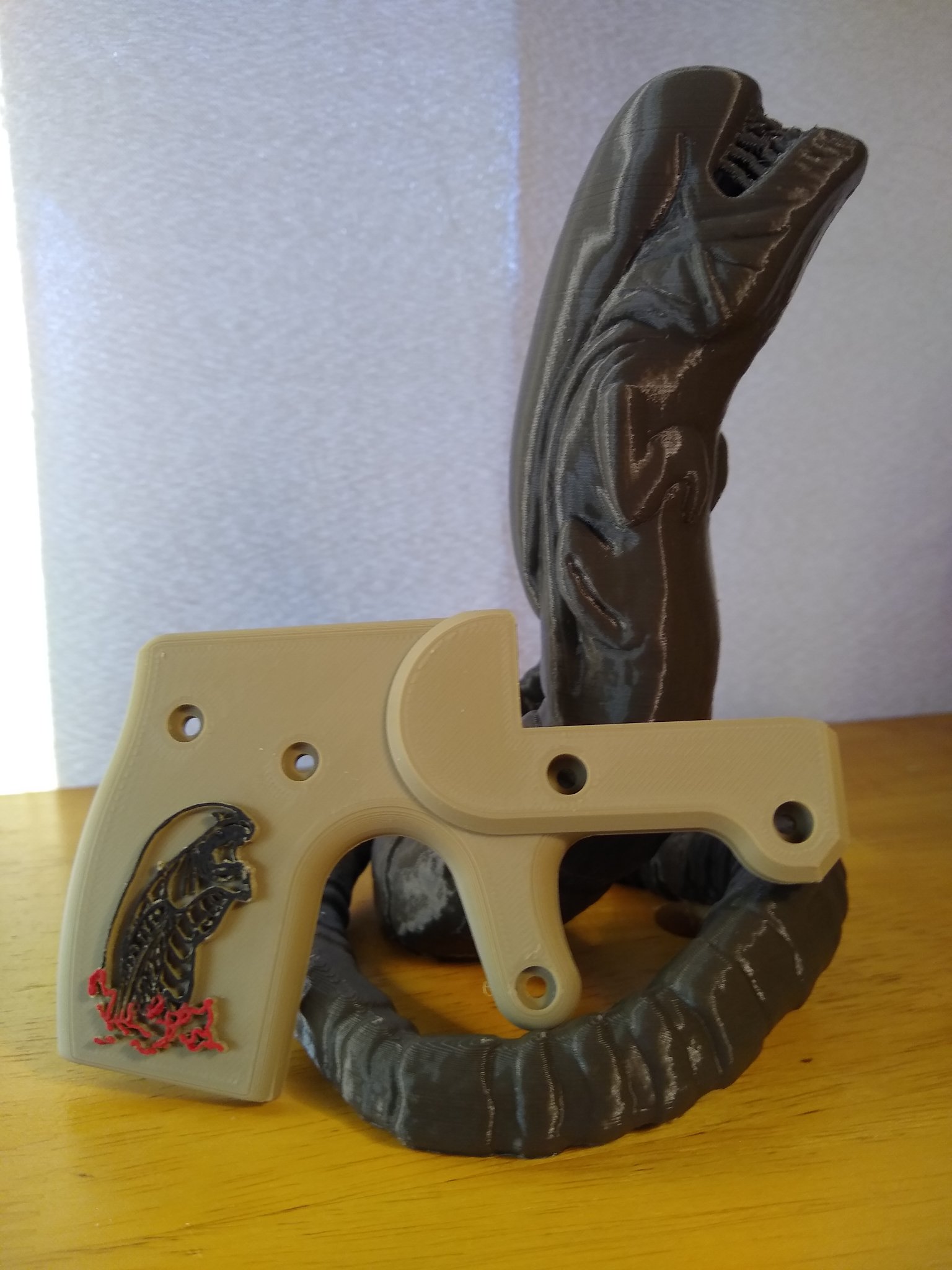 Mấy khẩu súng meme là chân ái! Những tấm ốp hông này có thể dùng để chế tạo một khẩu Harlot đủ sức săn lùng "Xenomorph XX121" của Weyland-Yutani. Có hai tấm ốp hông trái với các thiết kế khác nhau của sinh vật trưởng thành. Một là kiểu dáng bust tiêu chuẩn. Cái kia là logo lấy cảm hứng từ bộ lạc. Tấm ốp hông phải khắc họa con Chestburster. Tải các file còn lại từ khẩu Harlot gốc và đọc hướng dẫn nhé!