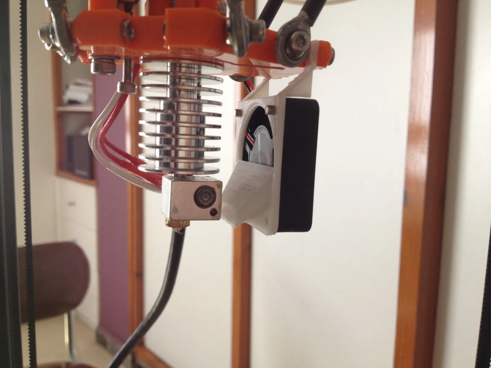 Sau một thời gian vật lộn với nhiều loại ống dẫn khí khác nhau mà không có kết quả tốt, tôi quyết định làm lại từ đầu và tạo ra một bộ phận để giải quyết hai vấn đề cùng lúc. Một mặt, tăng chút ít đường kính in tối đa, và mặt khác, dùng một quạt hiệu quả để làm mát tản nhiệt và ép đùn cho việc in cầu và phần nhô ra.