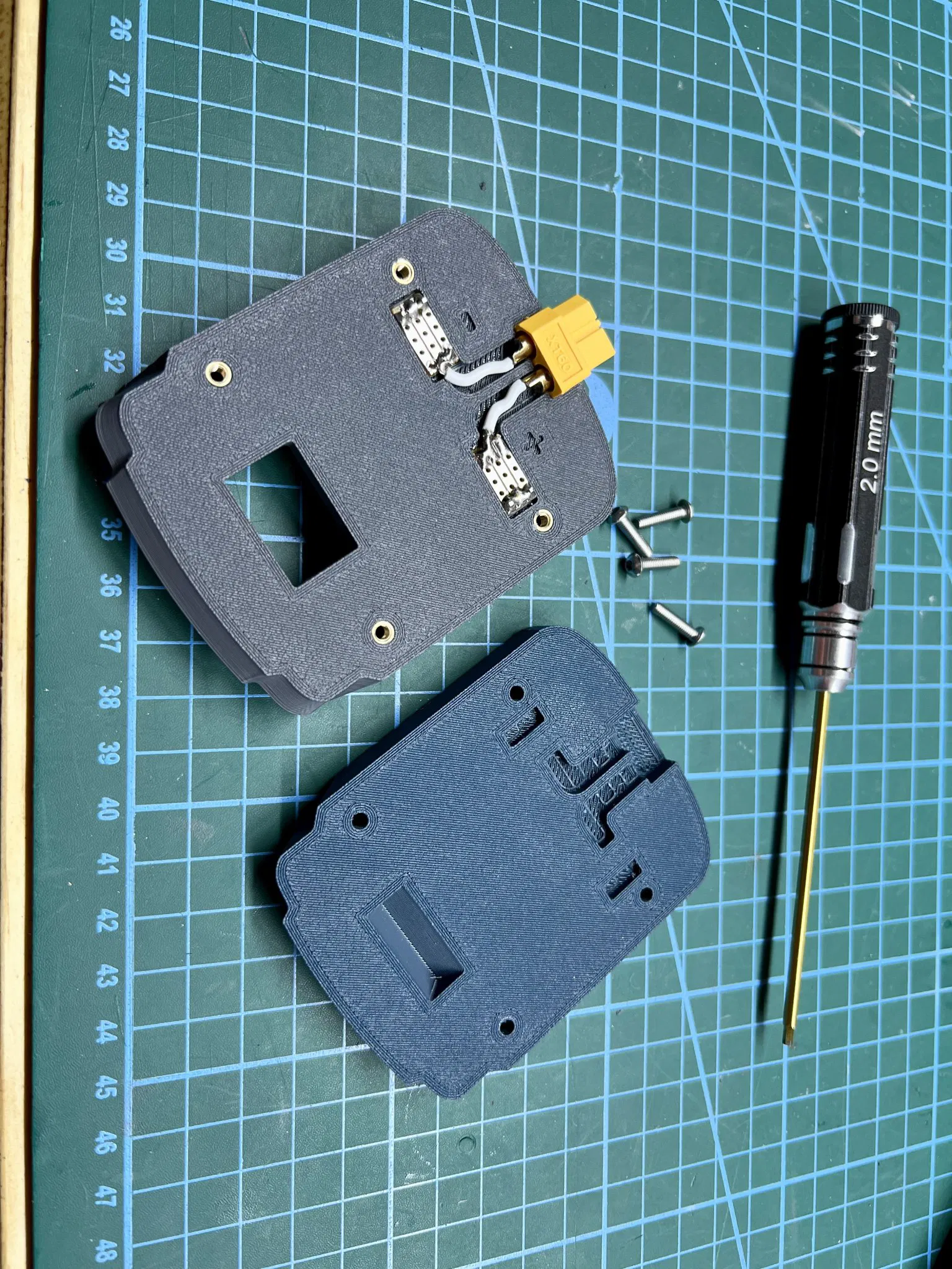 In các tệp theo hướng của tệp STL; Bạn sẽ cần hỗ trợ ở giao diện pin và có thể ở các khu vực có đầu nối và dây đi dây. Độ khớp của đầu nối XT60 khá chặt, nhưng tôi khuyên bạn nên dùng một ít keo CA để giữ nó cố định trên mô hình giao diện pin. Rõ ràng là bạn không nên dùng keo ở cả hai khoang trên và dưới. Tôi đã sử dụng vít đầu nút M3 x12 - độ dài chính xác là quan trọng để không ảnh hưởng đến pin.