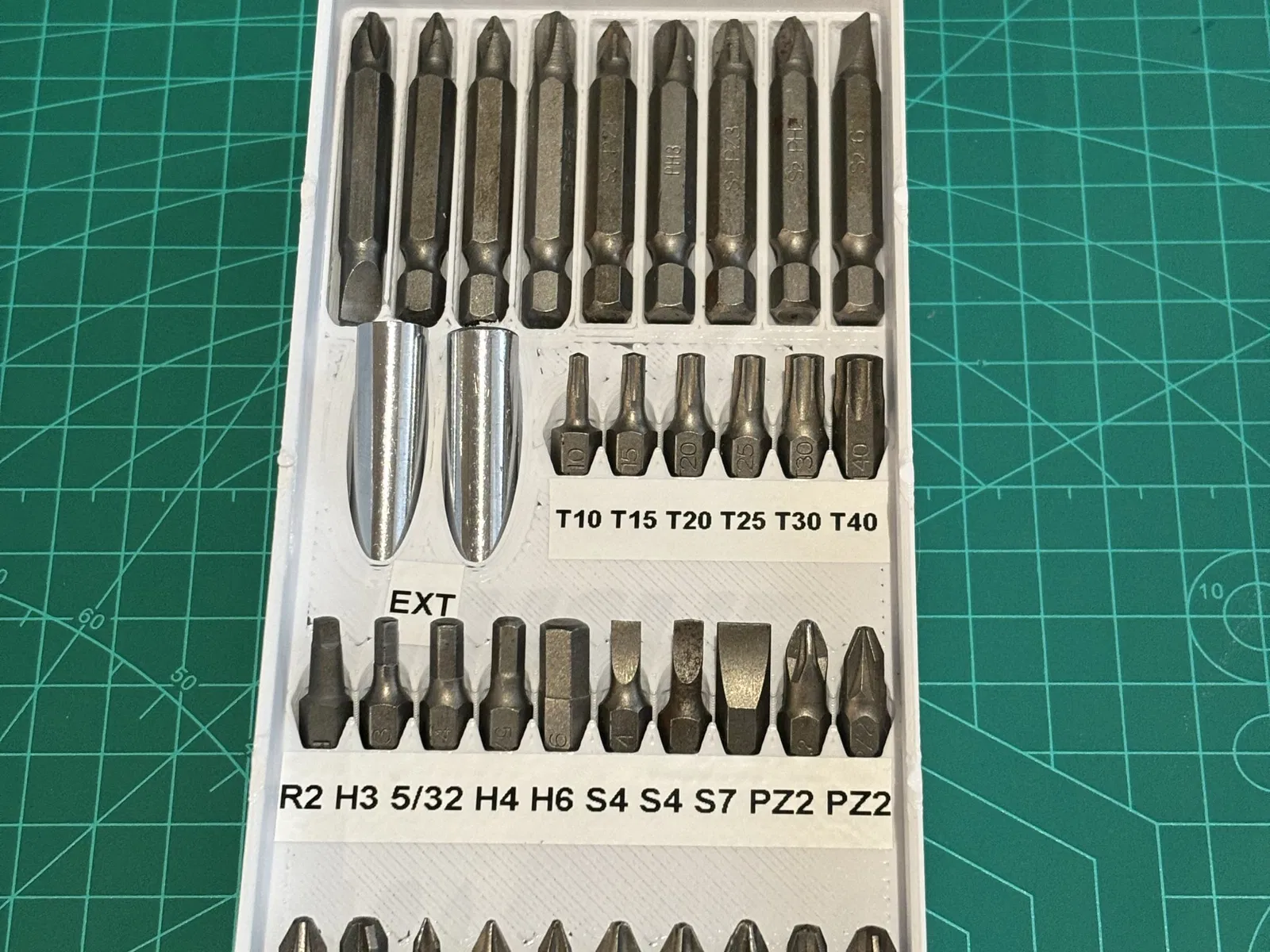 Các bit hex dài 9x, bit hex 2x extender, 26x bit hex ngắn trong một Gridfinity 4x2 (cao 2U)