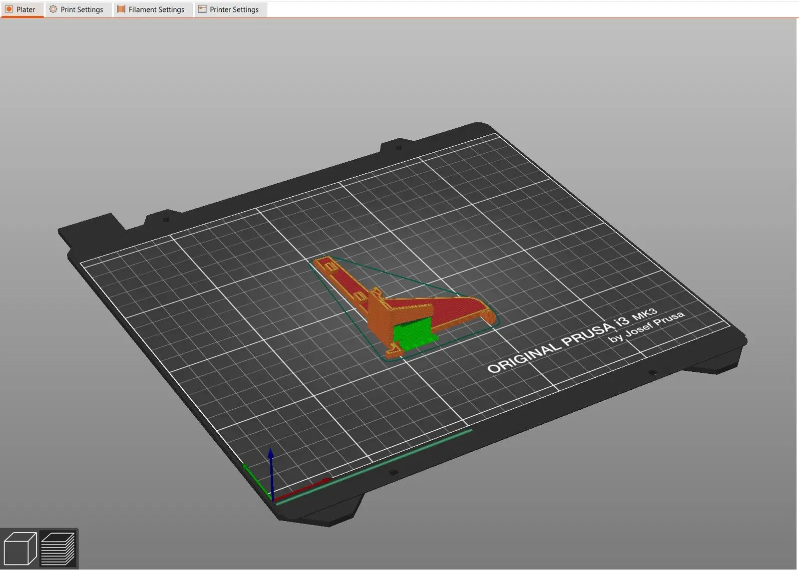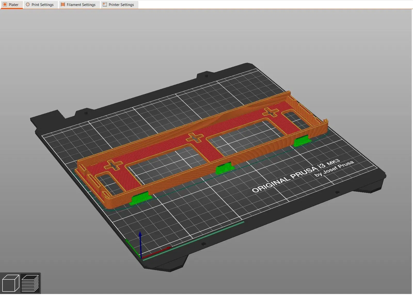 In bằng PETG, đầu phun 0.4mm, chiều cao lớp 0.2mm, 3 đến 4 lớp bao quanh để tăng độ bền, 30% lưới nhồi, hỗ trợ sơn như hình. Nếu muốn cứng hơn thì dùng PLA.