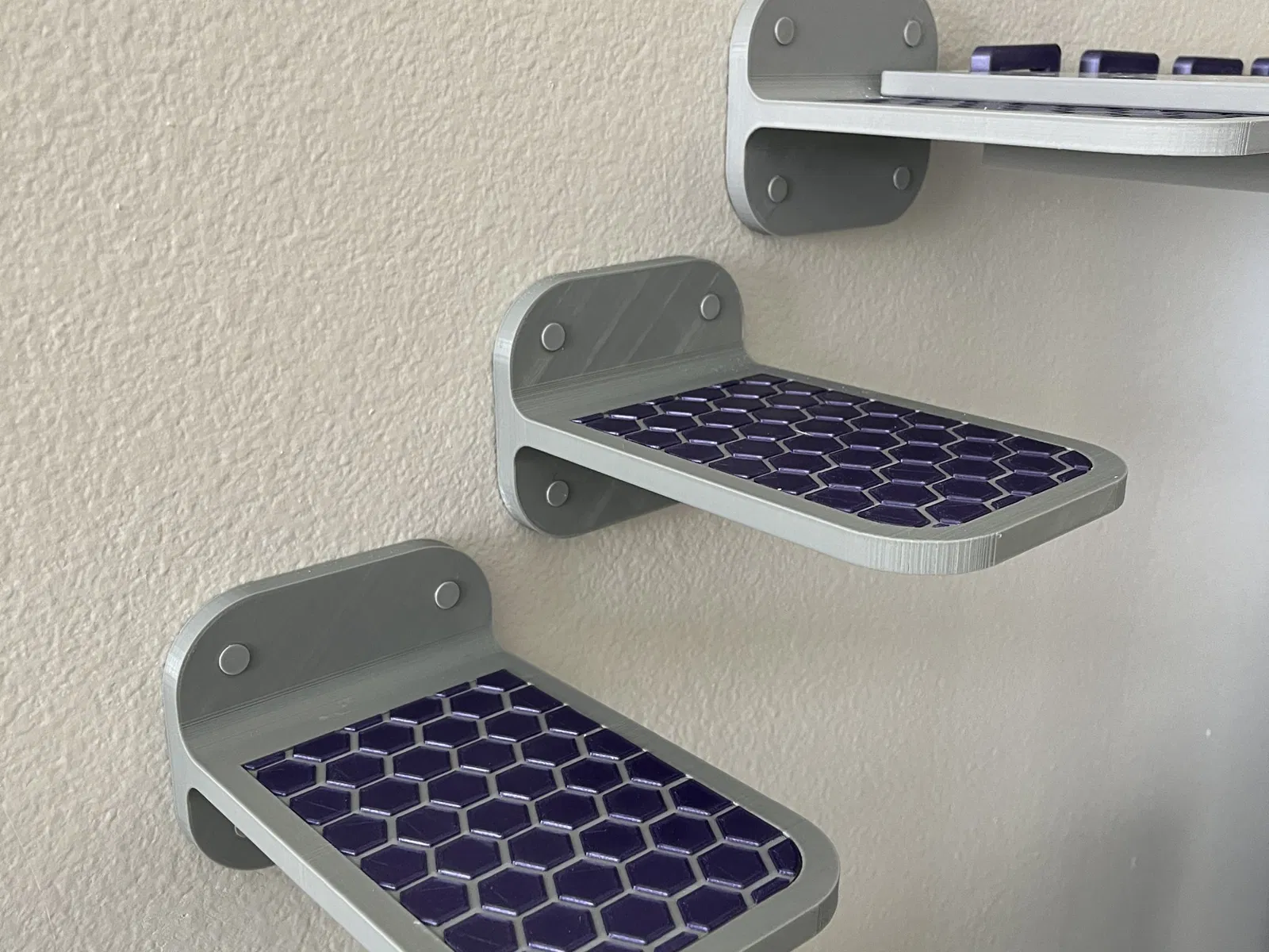 New model posted with improved designs: https://www.f3d.vn/3d-model/148640-bac-thang-treo-tuong-cho-meo-3-phien-ban I found wall mounted steps on amazon and thought this could totally been done with 3D printing. Please use care when printing and mounting, use drywall anchors or mount into studs. High infill is a must for strength. If needed scale it to fit your cat better, my cat is small and they fit her well. There is a cutout in the step to fit the provided honeycomb insert or if you would like use the insert as a template to cut small pieces of carpet to glue onto it, that would work nicely and double for scratching. My cat really enjoys them :)