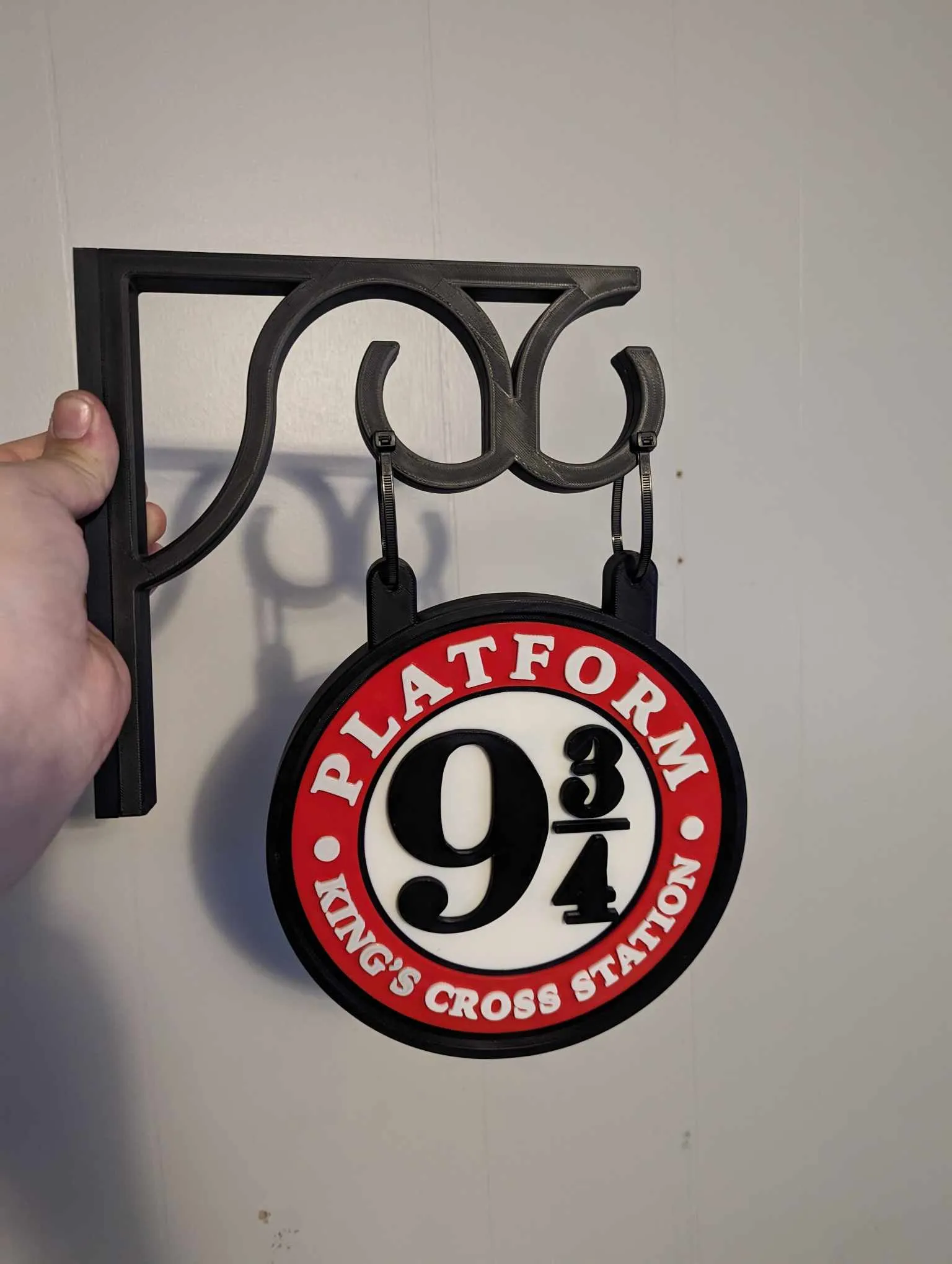Đây là một bảng hiệu sân ga 9 ¾ từ Harry Potter. Bạn có thể in bảng hiệu hai lần để có một bảng hiệu hai mặt, hoặc in một lần cho bảng hiệu một mặt. Cần phải in gương cánh tay treo và in cả hai mặt để sử dụng giá treo tường. Giá treo được thiết kế để dễ dàng treo, sau đó cánh tay được trượt vào từ phía trên bằng khớp đuôi én.