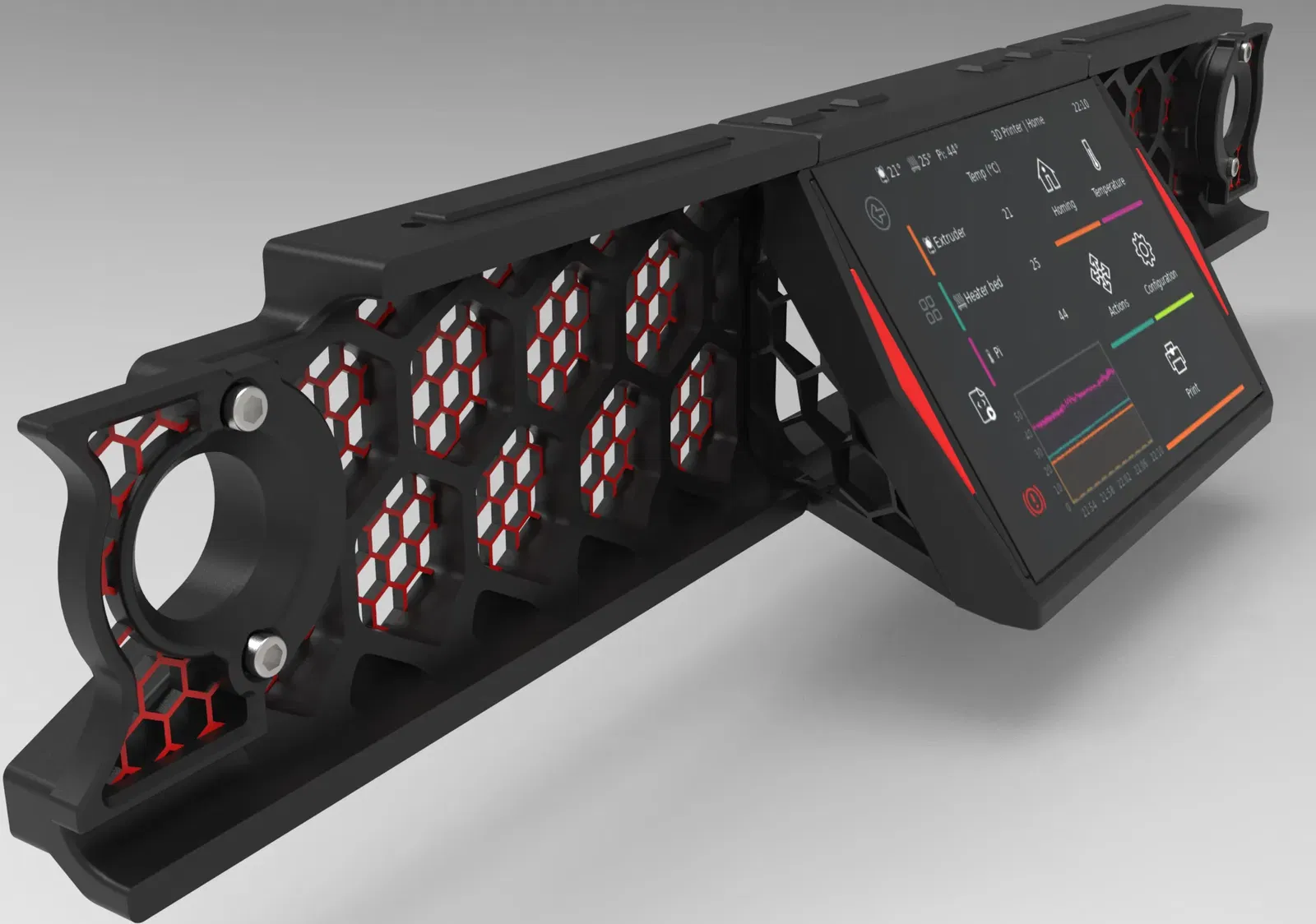 Cái màn hình được giữ vào vỏ bằng 4 con ốc lục giác chìm M2.5x8mm nha. Cái vỏ thì gắn vào thanh ray 2020 của Voron bằng mấy con ốc lục giác chìm M3x8mm mặc định.