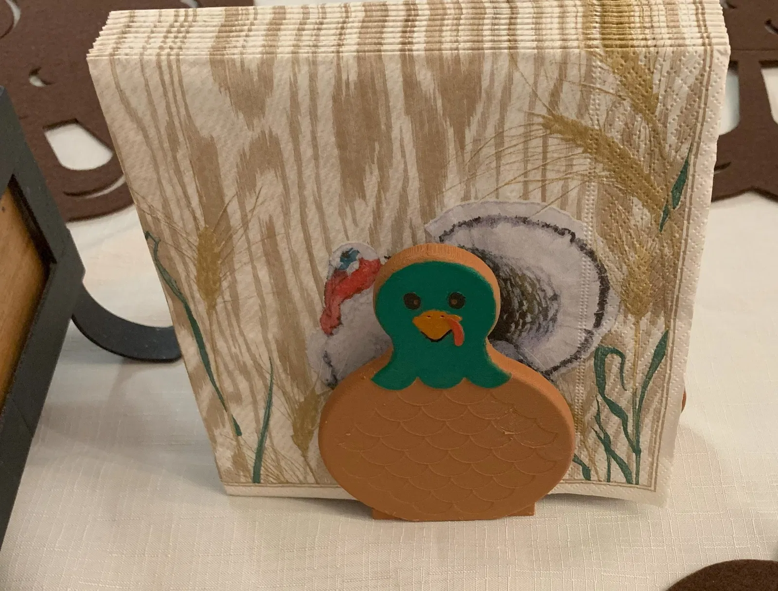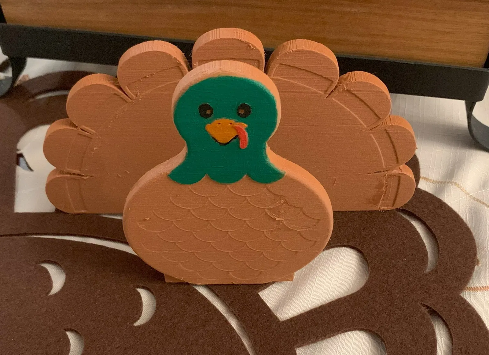 Chiếc giá đỡ khăn ăn hình gà tây phiên bản truyền thống này được làm để giữ các loại khăn ăn khác nhau. Người dùng có thể in bằng PLA gỗ để tạo hiệu ứng sần sùi và sơn trang trí thêm. Cần dùng support cho phần đế và hai lông vũ đầu tiên khi in.