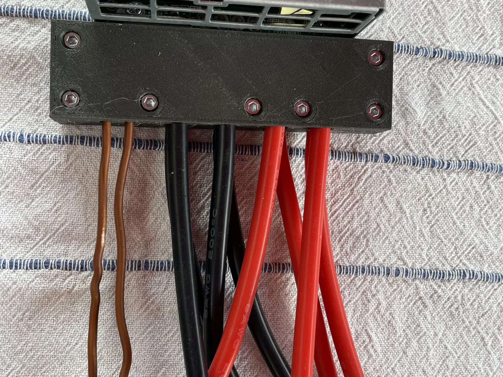 This plug can be used to attach cables to the +12V and GND output of a server power supply. You need the following additional parts: