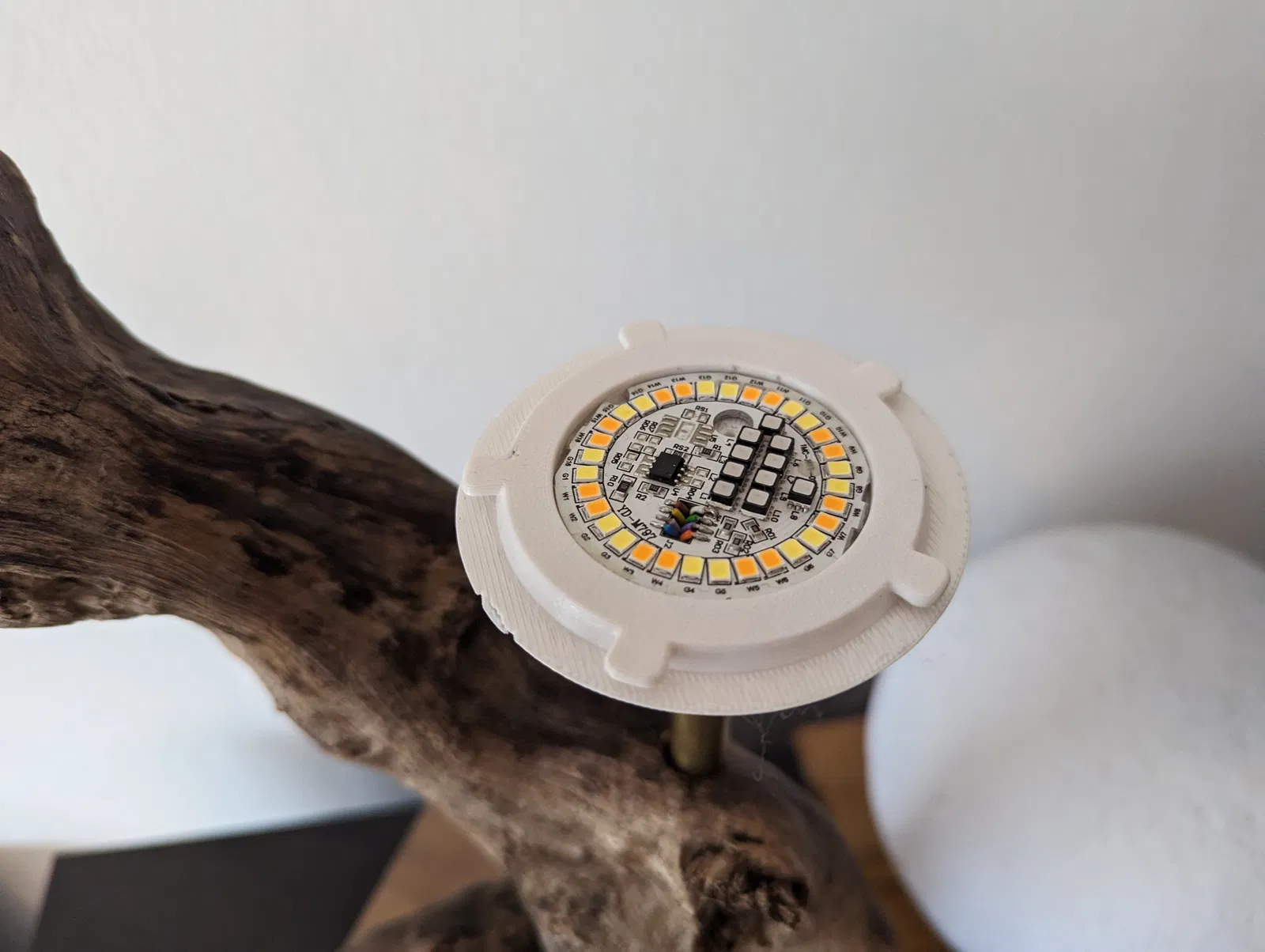 Cái đèn mặt trăng thì ok, mà cái đế thì kỳ cục. Cái cover này có chỗ để gắn module LED lấy từ bóng đèn thông minh LCD. Dây thì đi xuống ống để tới bo mạch, chỗ này có đặt PCB. Cái lỗ là cho ống 12 mm nha.