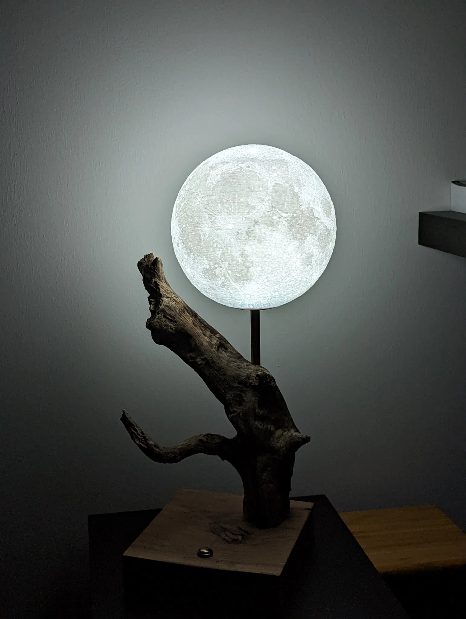 Cái đế này giúp bạn gắn đèn mặt trăng lên trên một cái chân ống. Có chỗ để gắn module LED từ bóng đèn LCD thông minh, dây đi xuống dưới ống rồi tới bo mạch ở chân đế. Lỗ gắn ống có đường kính 12 mm.