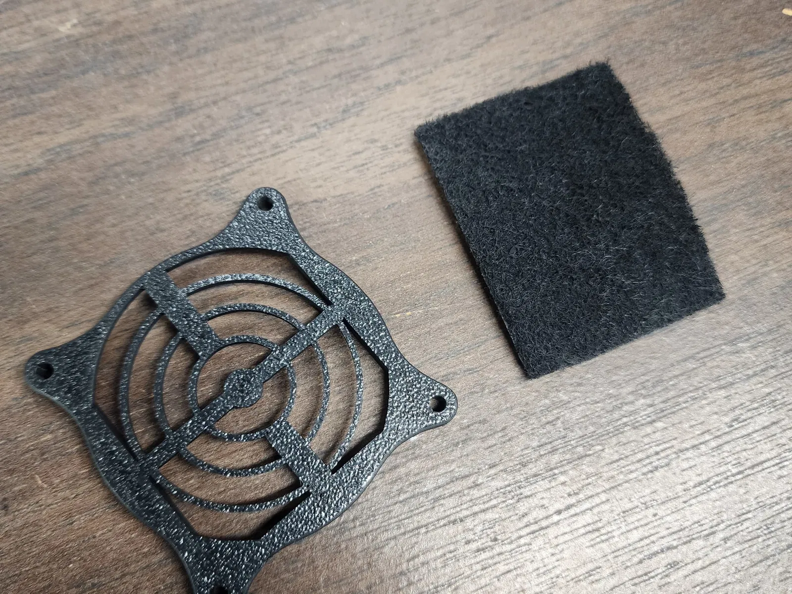 Một bộ phận che quạt để tích hợp một tấm lọc carbon. Vật liệu lọc có bán sẵn trên Amazon. Tôi đã lắp 4 miếng ren nhiệt M3 bằng đồng thau và sử dụng ốc vít nguyên bản giữ bộ phận che quạt cũ. Nếu bạn không có ren nhiệt bằng đồng thau, bạn có thể dùng ốc vít M3 dài hơn một chút và đai ốc.