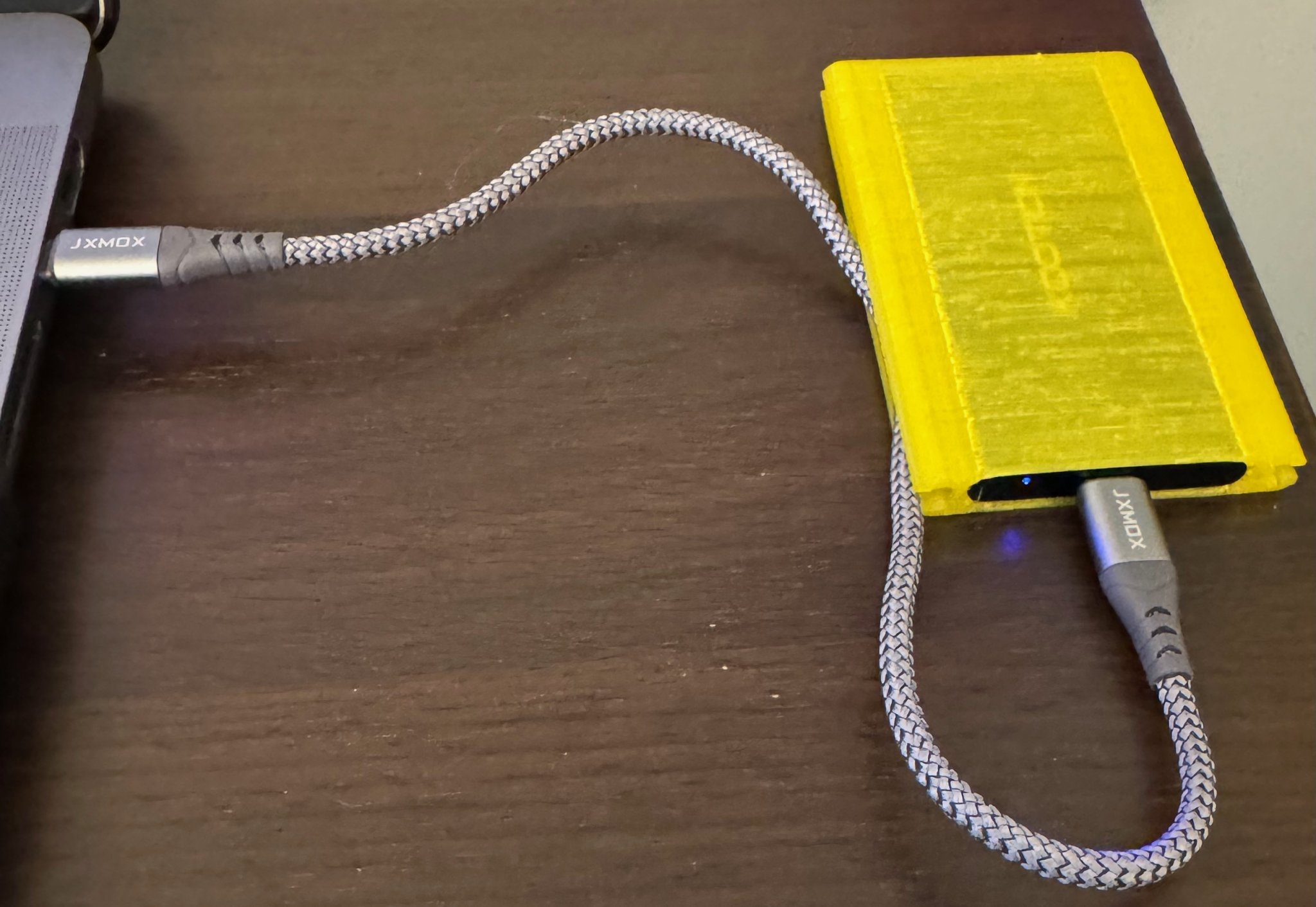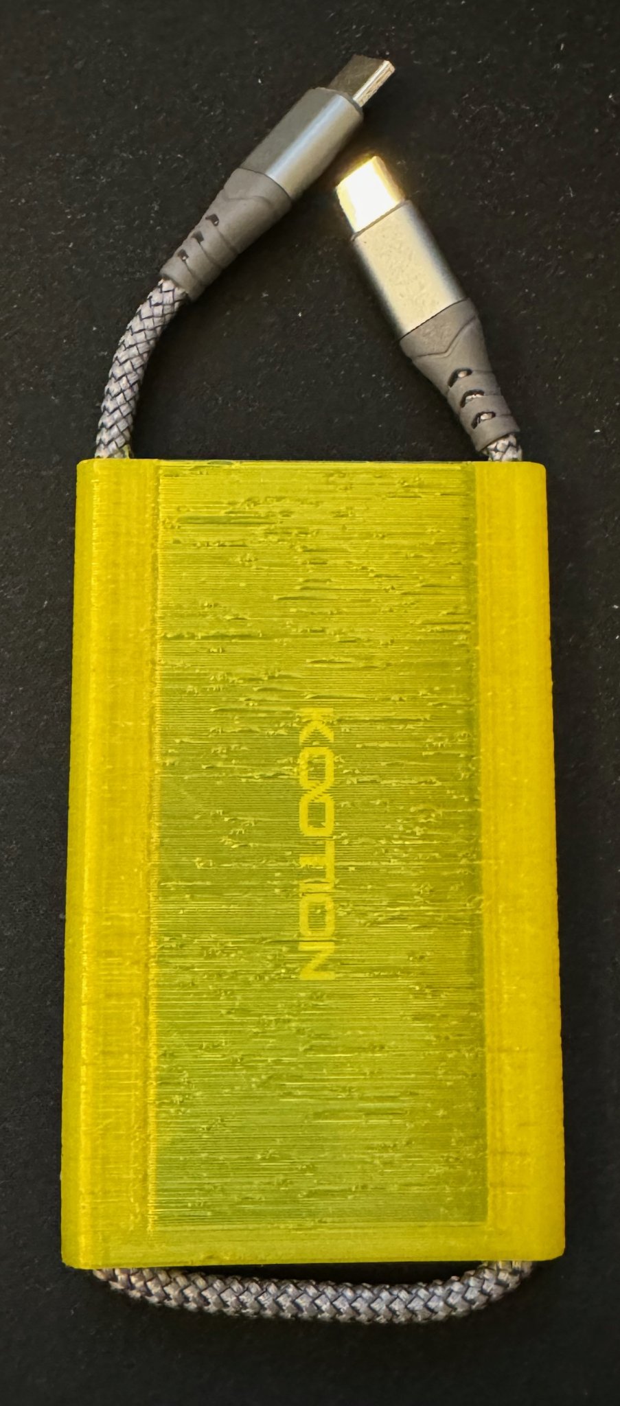 Vỏ bọc và chỗ giữ cáp cho ổ SSD USB-C nhỏ của Kootion. Ổ cứng trượt vào vừa khít, cổng USB-C và đèn LED vẫn dùng được. Rãnh bên hông giữ cáp USB-C ngắn lại cho gọn.