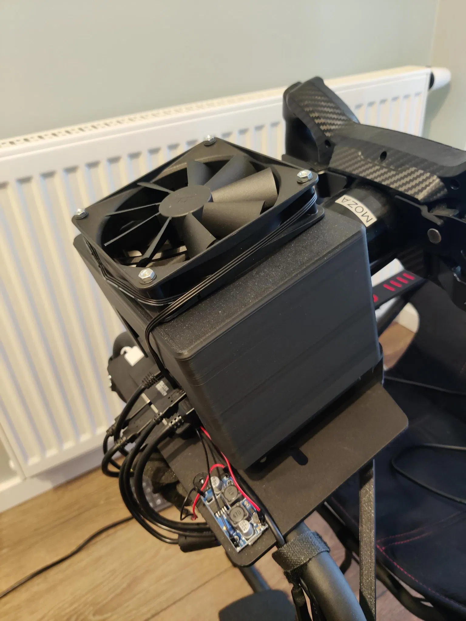 Nhà ở cho căn cứ Moza R5 với giá treo quạt để làm cho nó mát hơn một chút.