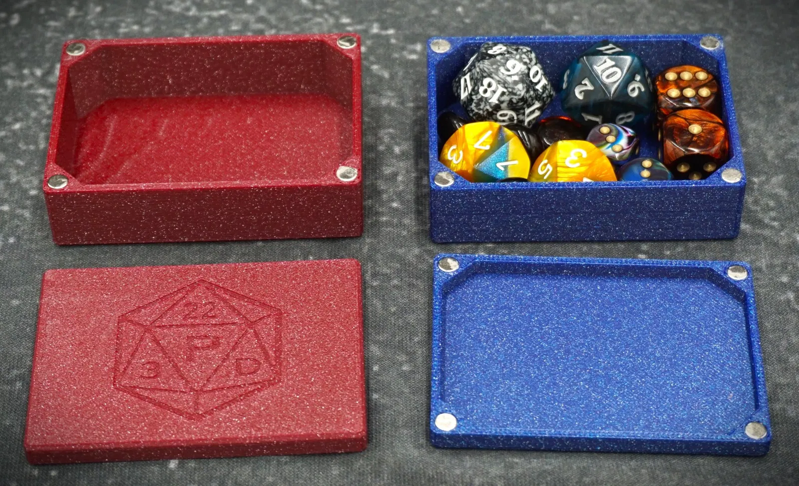 Một chiếc hộp xúc xắc nhỏ gọn, tiện dụng có nam châm giữ nắp chắc chắn khi vận chuyển. Hoàn hảo cho các trò chơi bàn cờ, D&D, MTG, TCG.