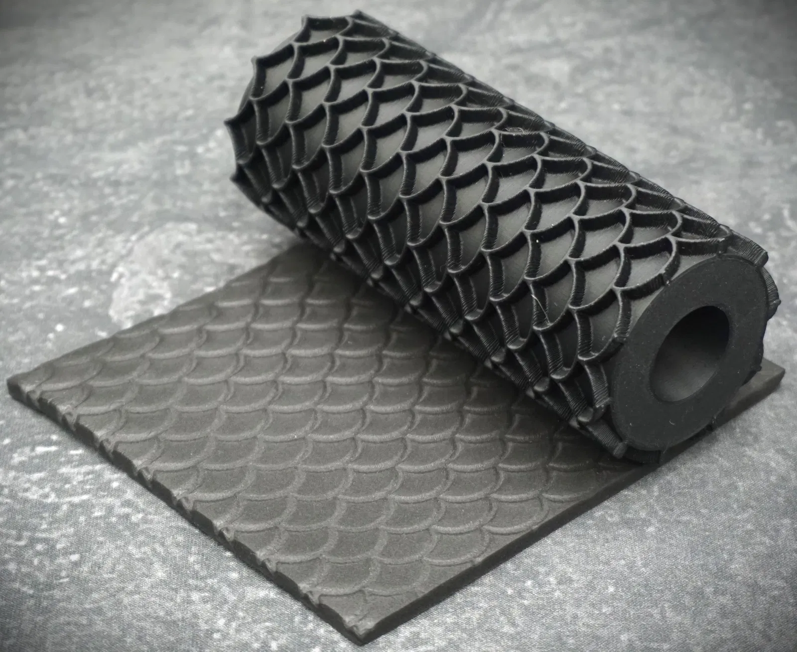 Ở đây tui có cái con lăn tạo vân để tạo hoa văn trên nhiều loại vật liệu mềm khác nhau nè. Chúng tui đã thử nghiệm với xốp, đất sét và thạch cao, nhưng mà khả năng ứng dụng thì vô biên luôn.