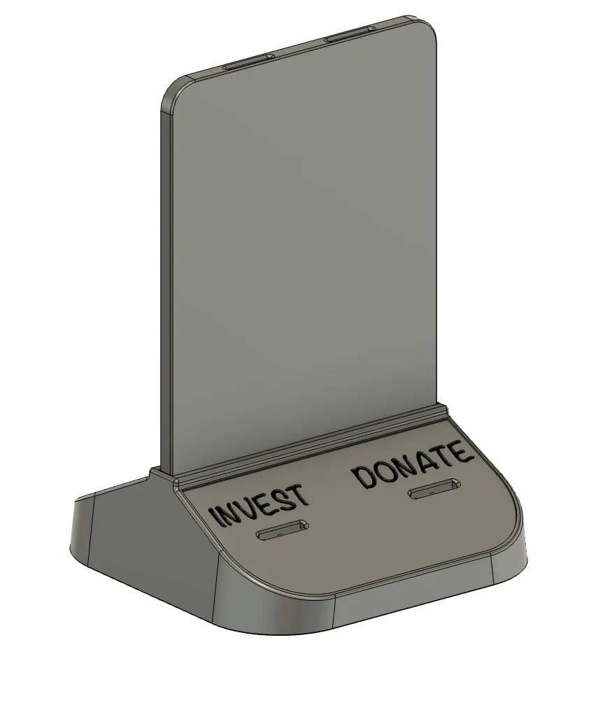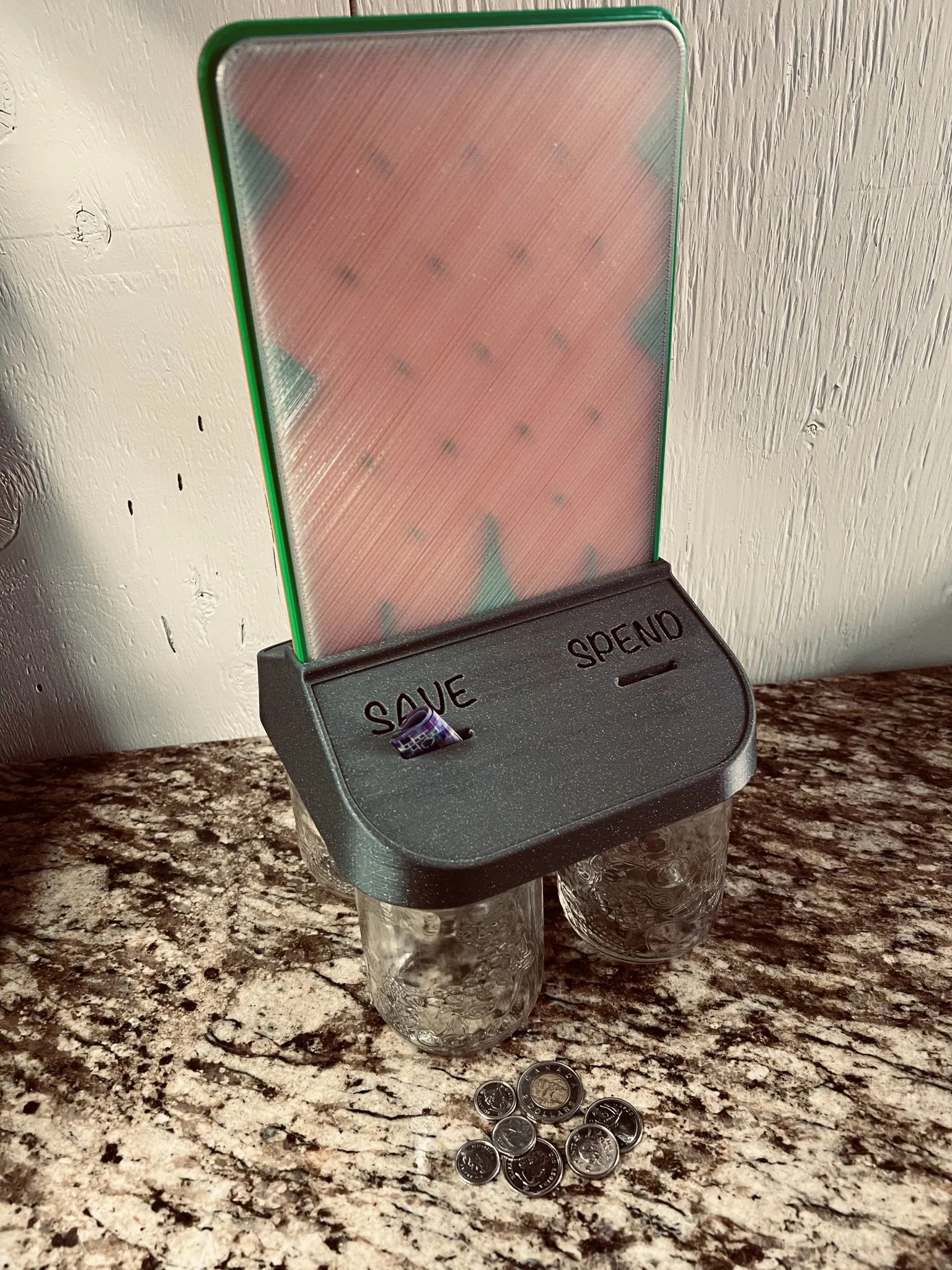 CẬP NHẬT: Sau khi in tấm nắp và thử nghiệm nhiều loại đồng xu khác nhau, tôi nhận thấy đồng xu lớn nhất tôi có (Canadian Toonie) sẽ bị kẹt ở cạnh dưới của các khe “Save” và “Spend”. Tôi đã cập nhật nắp để bao gồm một góc nghiêng để đồng xu lớn hơn đi qua dễ dàng hơn.