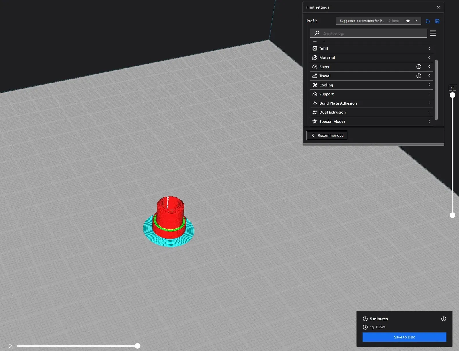 Tất cả các bộ phận được in với độ cao lớp 0.2mm, mật độ vật liệu 15%, tốc độ 50mm/s, dùng PLA ở nhiệt độ 200°/60° và có hỗ trợ khi cần. (không cần hỗ trợ cho các ren với thông số này!)