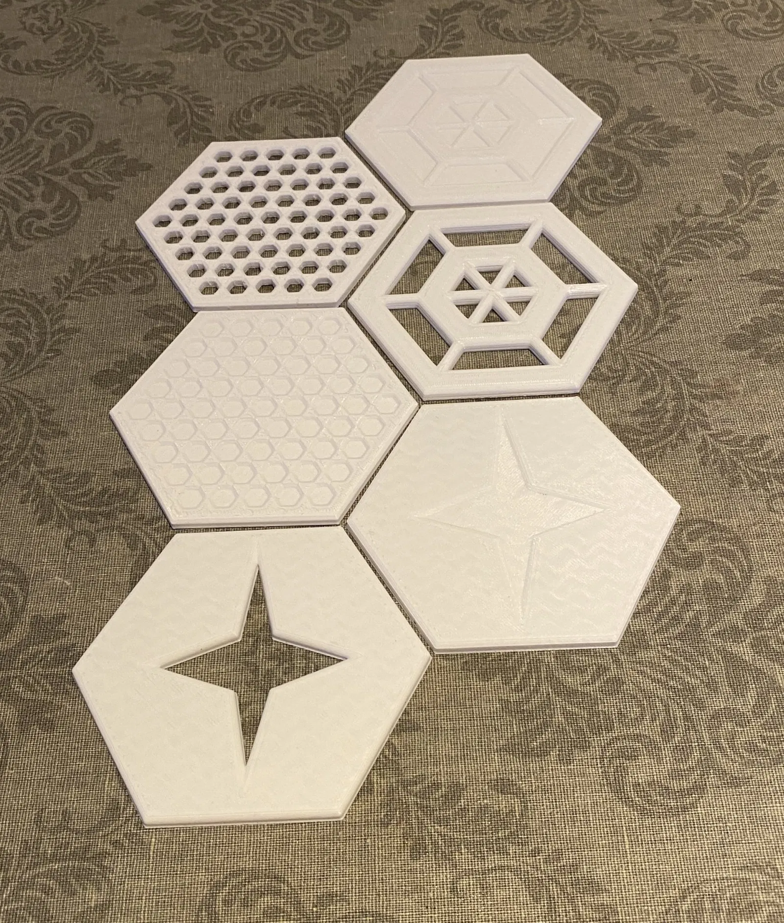 A simple coaster with holder for 6 pieces. Also supplied 3 different coaster designs with two versions of each design. One where the design is a hole through, which saves material, and one where it is just stamped.