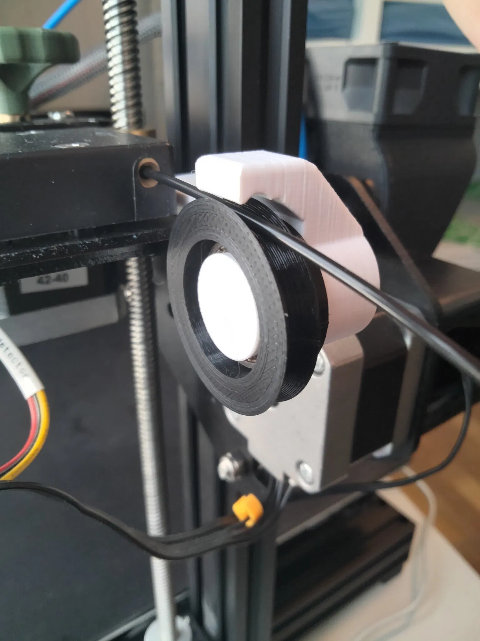Tìm hoài không thấy cái bộ dẫn dây tóc (filament guide) nào đơn giản cho Ender 3 Max của tui, nên tui tự làm luôn. Chỉ cần 1 cái vòng bi 608 thôi. Gắn vô là xong, không cần ốc vít gì hết. Hơi cứng chút, nó sẽ khớp vô cái lỗ trên cái đế gắn.