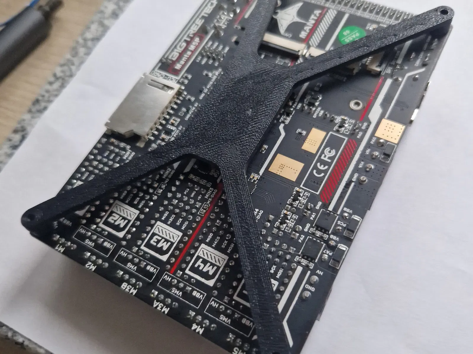 Mô tả chi tiết cái đế Manta M5P của Big Tree Tech dành cho máy in 3D Voron 0.1. Sản phẩm được gắn bằng băng keo VHB, sử dụng 4 con vít M3 6mm để cố định trực tiếp vào vật liệu nhựa, mang lại sự chắc chắn và dễ lắp đặt.