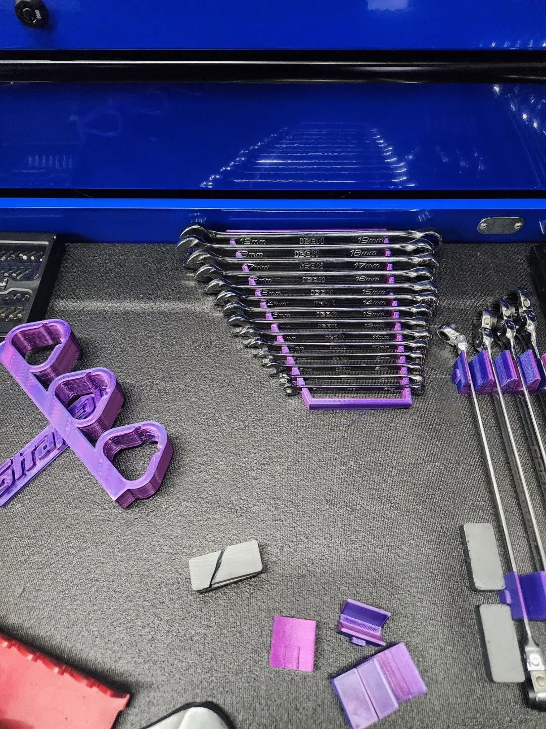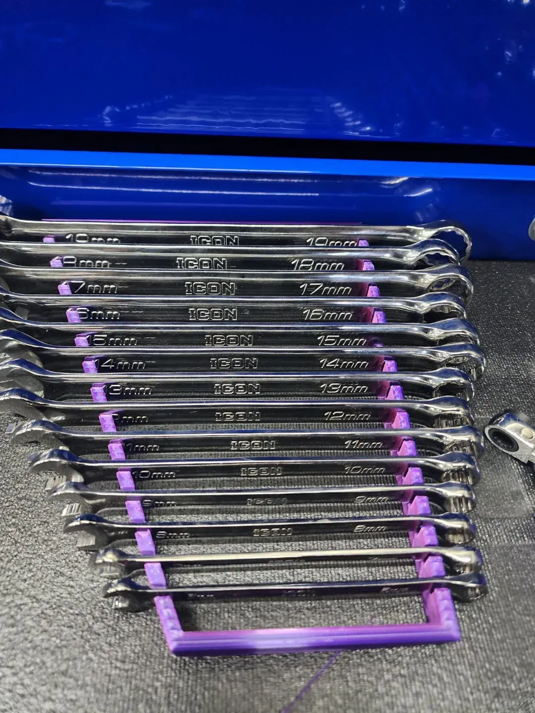 Dùng để đựng bộ cờ lê 14 cái Icon loại metric bán tại Harbor Freight. Thiết kế tối ưu cho việc sắp xếp gọn gàng bộ cờ lê của bạn, giữ chúng luôn ngay ngắn và dễ tìm. Sản phẩm in 3D này là giải pháp hoàn hảo cho các anh em thợ.