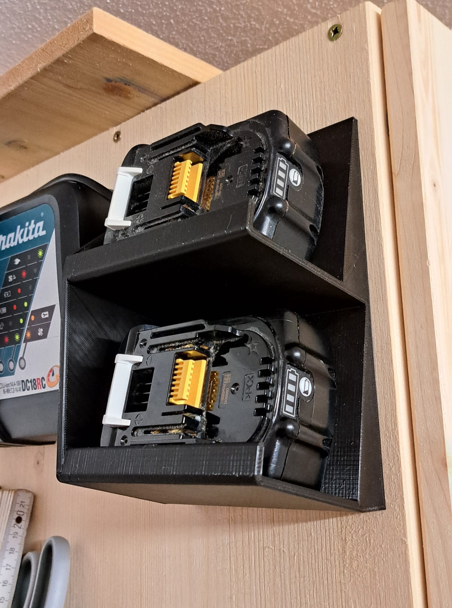 Wall mounted battery holder designed for 2 Makita 18V batteries.