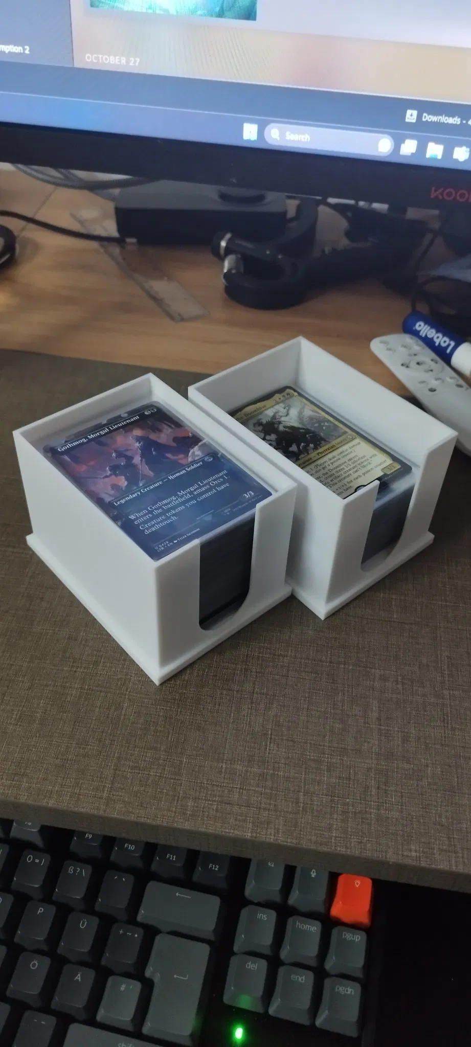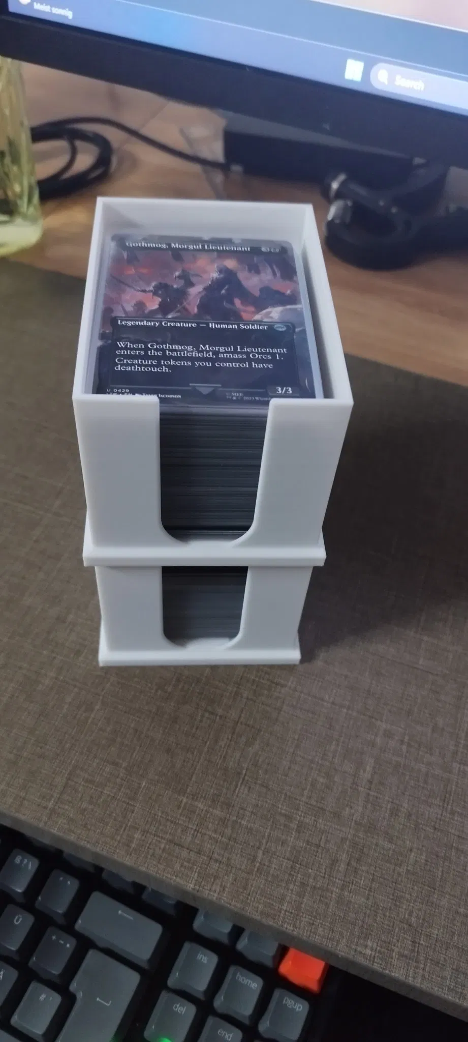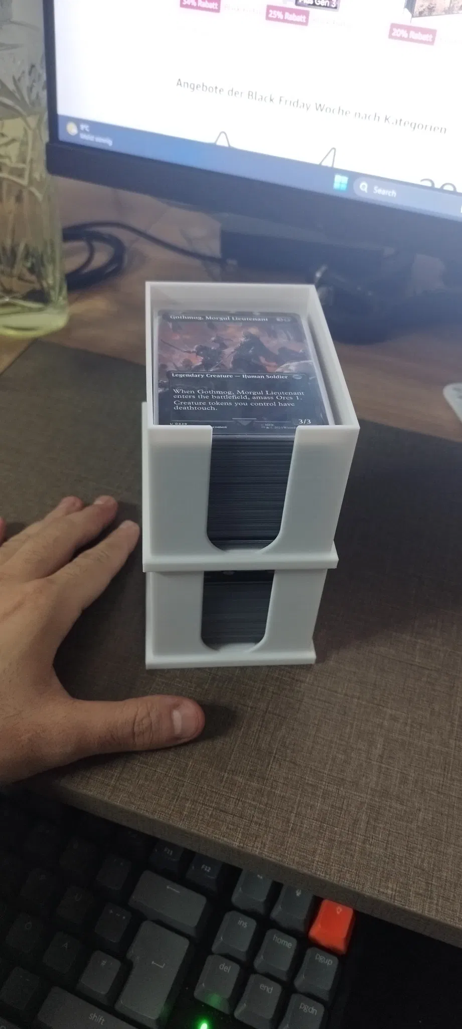 Trong hình, hộp đầy hơn chứa khoảng 150 lá bài, hộp vơi hơn là một bộ bài commander 100 lá.
