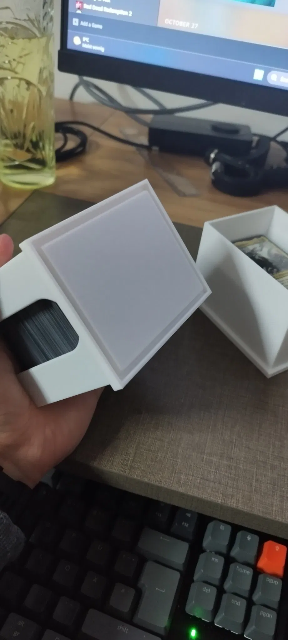 Hộp đựng bài xếp chồng đơn giản, vừa khoảng 150 lá bài tiêu chuẩn có bọc. Có rãnh nhỏ ở đáy giúp lấy bài dễ dàng. Không cần vật liệu hỗ trợ, in bằng PLA/PLA+ với cài đặt Fill 15%, Walllines 2, Layer Height 0.2mm.