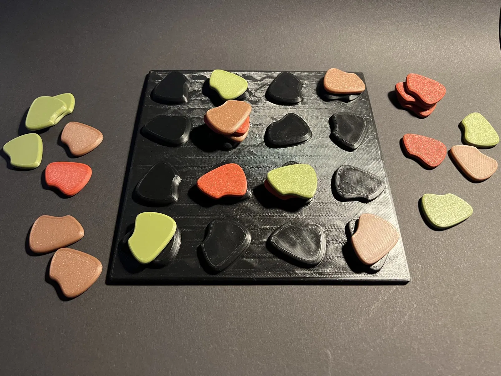 Mỗi người chơi có 8 quân cờ cùng màu. Màu thứ ba là màu trung lập, và những quân cờ này được đặt ở 4 góc của bàn cờ.