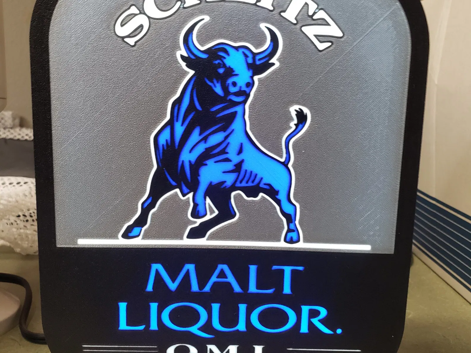 Hộp đèn Bia Schlitz, in 2 mảnh, cần dải đèn LED và keo dán để ghép lại. In bằng đầu phun .04, 20% Adaptive Cubic Infill, đặt mặt vân xuống, sử dụng máy Bambu X1C.