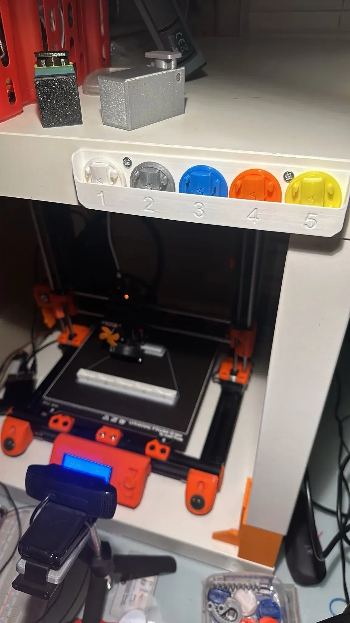 Cái đế giữ này có thể bắt vít vào hộp đựng và có thể giữ 5 màu theo đúng thứ tự đã nạp vào MMU. Có hai phiên bản: một cái chỉ có số lõm và một cái có số in màu khác biệt.