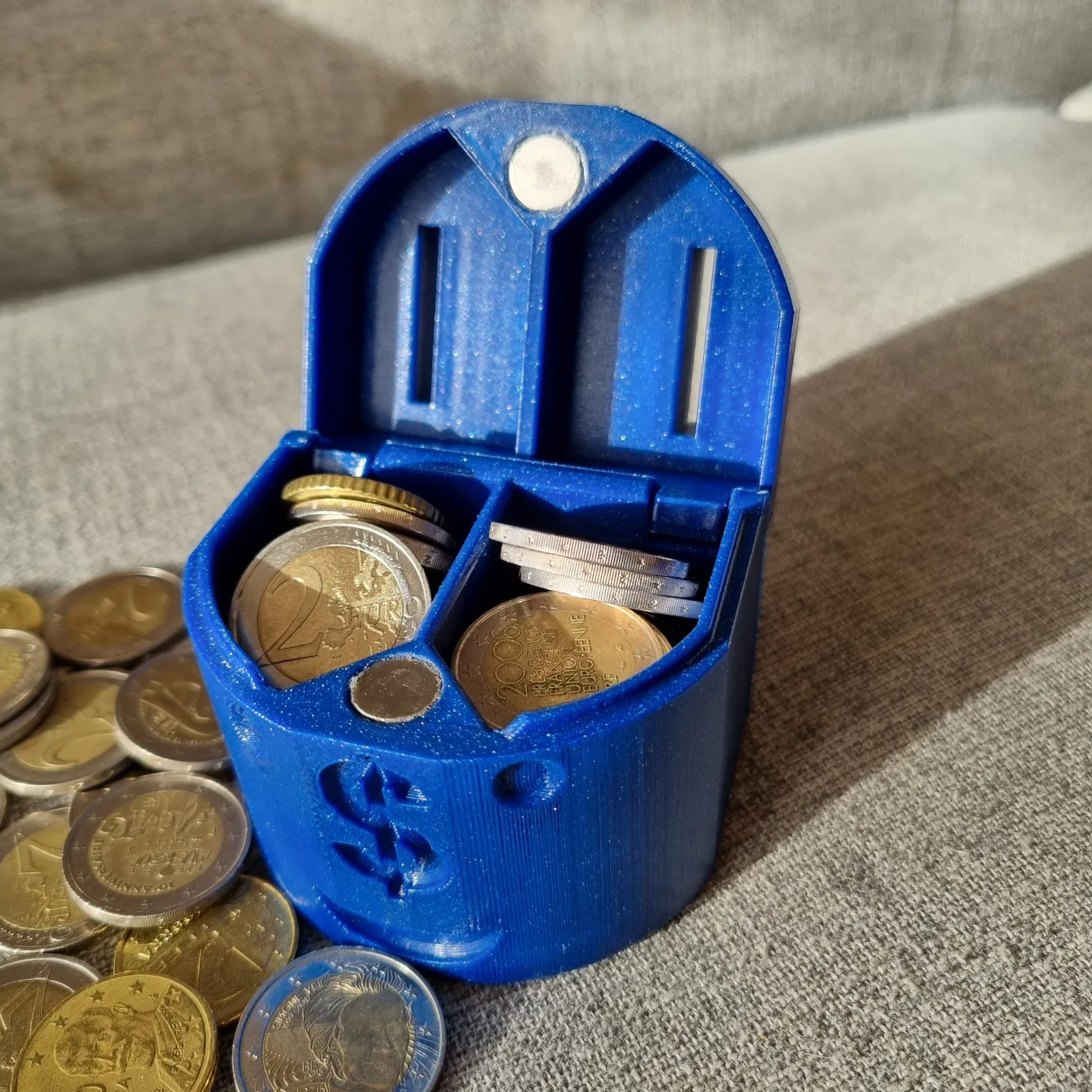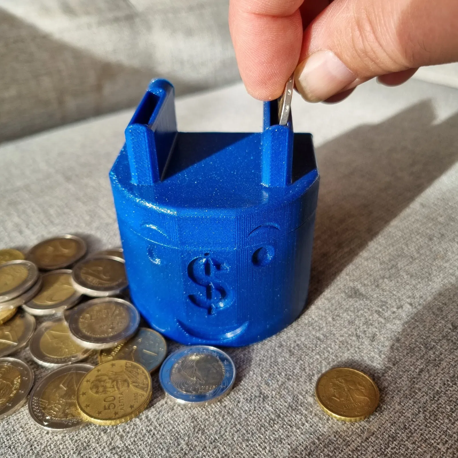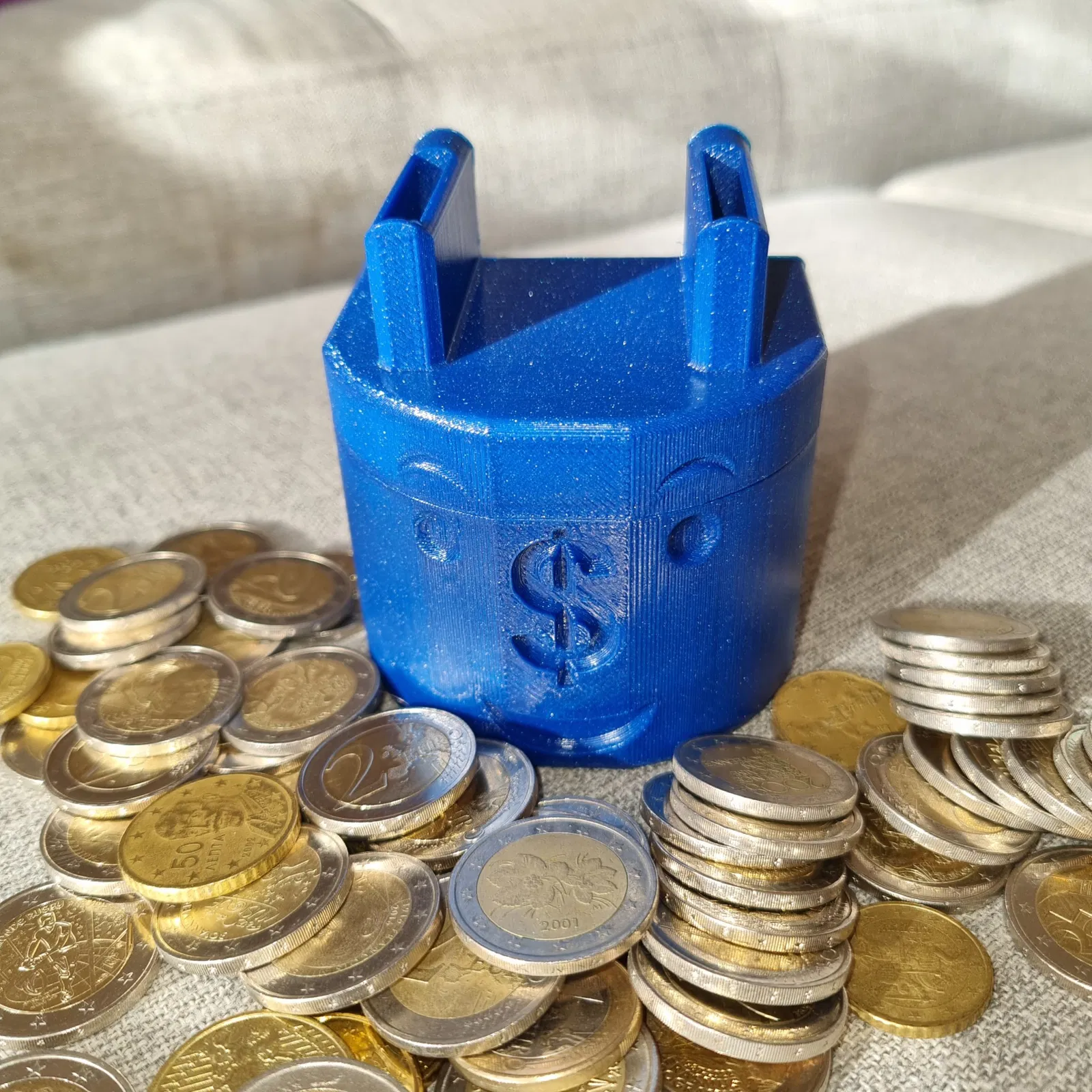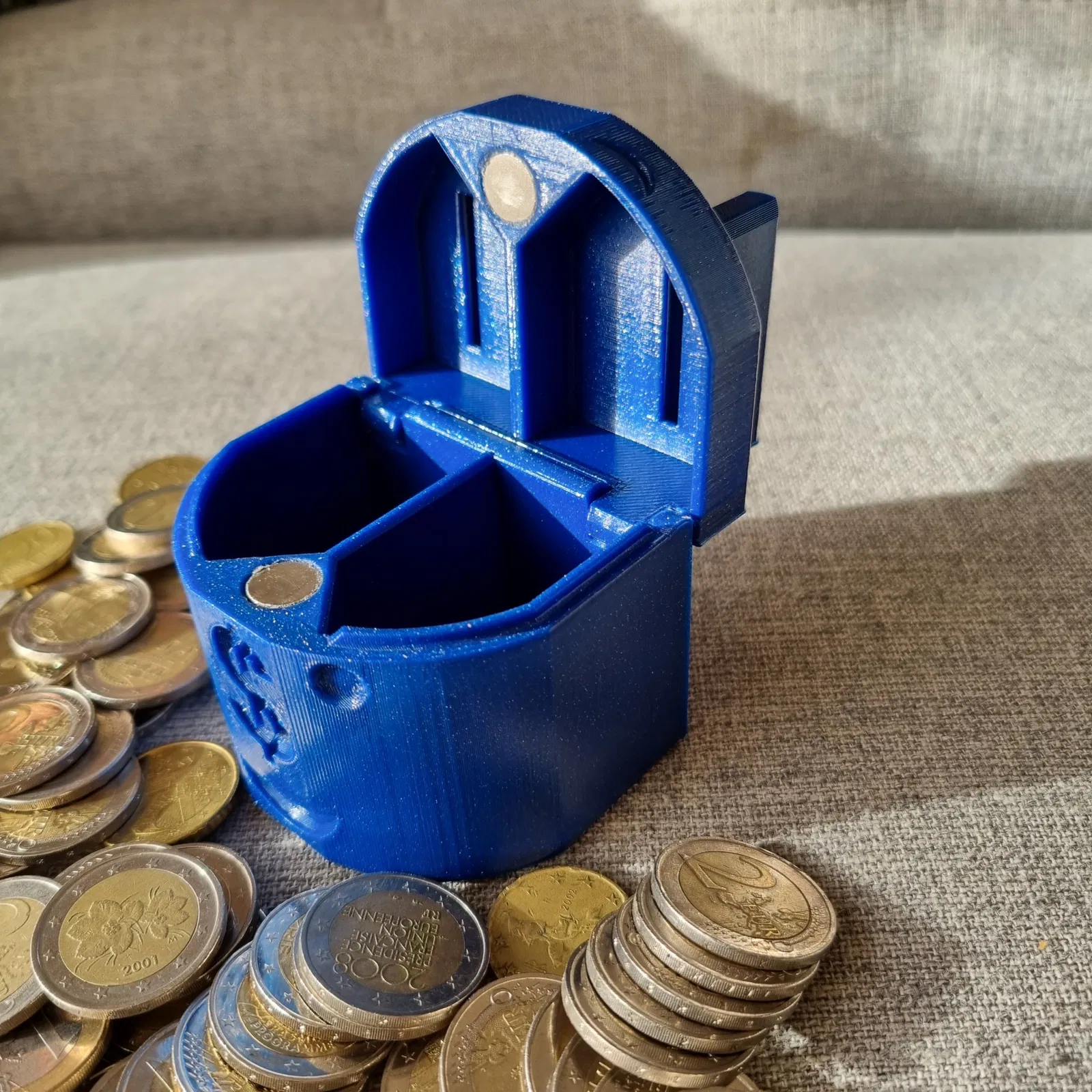 Heo đất hình hộp độc đáo, có bản lề in liền không cần đế. Có 2 ngăn, có thể dùng nam châm nhỏ để đóng. In bằng PLA, dày 2mm, đặt mặt sau xuống bàn in.