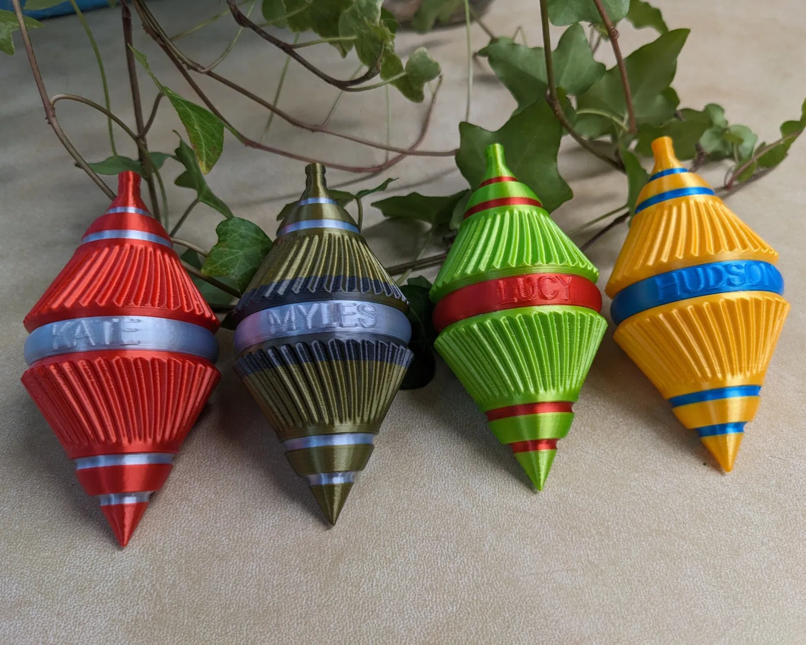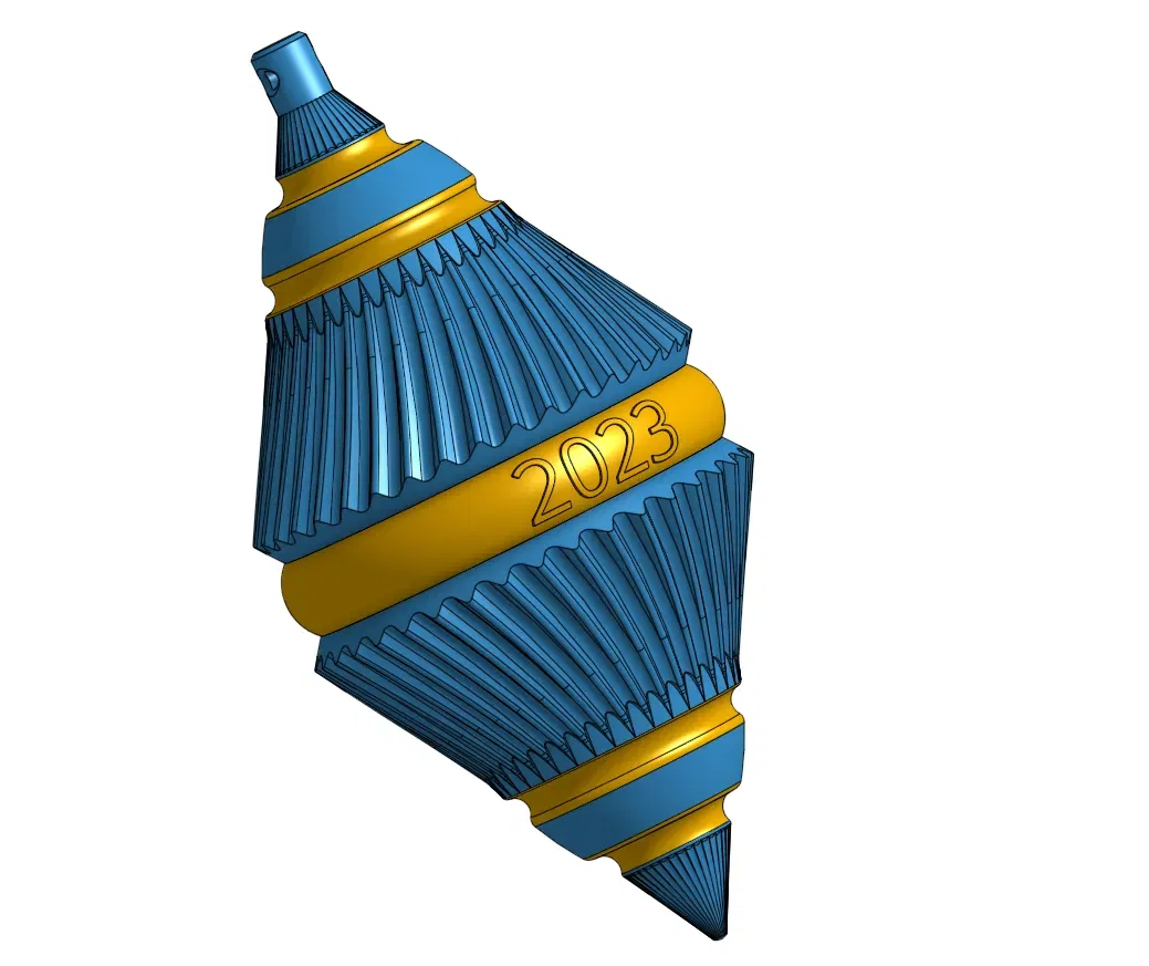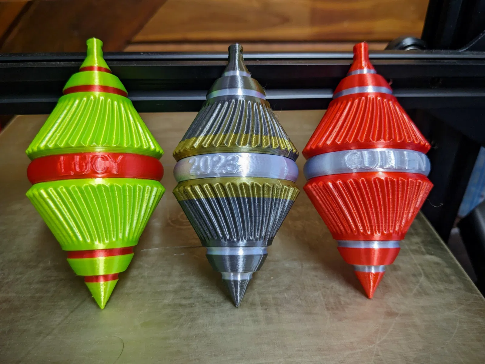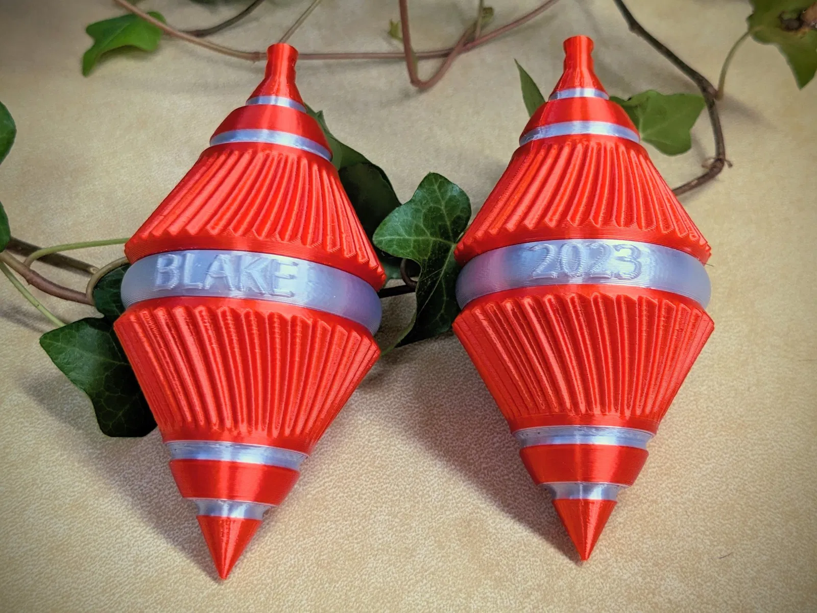 Năm nay mình thiết kế một phụ kiện lấy cảm hứng từ thủy tinh màu có vân sơn theo phong cách thập niên 1950, được làm theo kiểu nhiều bộ phận và nhiều màu sắc. Hồi còn nhỏ, mẹ mình có rất nhiều đồ trang trí theo phong cách này mà bà được thừa hưởng từ thời thơ ấu. Thiết kế bao gồm một vòng tròn ở giữa có thể tùy chỉnh trong CAD hoặc PrusaSlicer để cá nhân hóa bằng cách khắc chìm tên và năm.