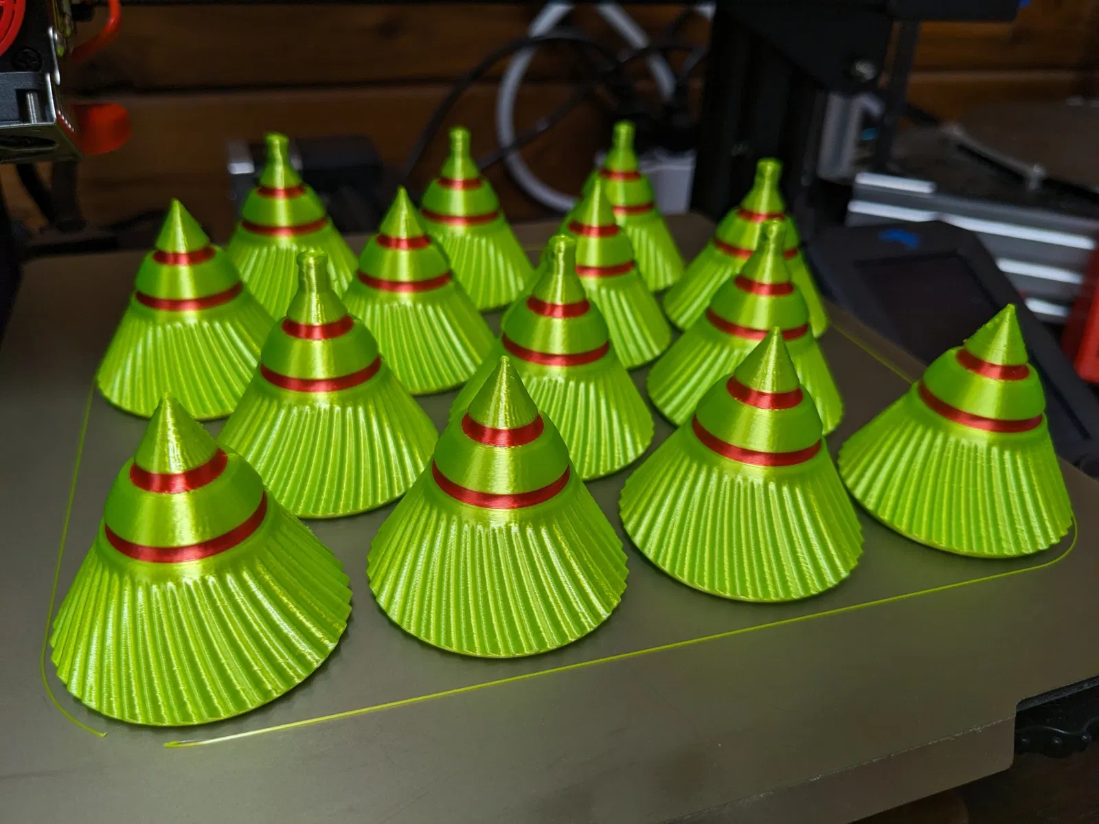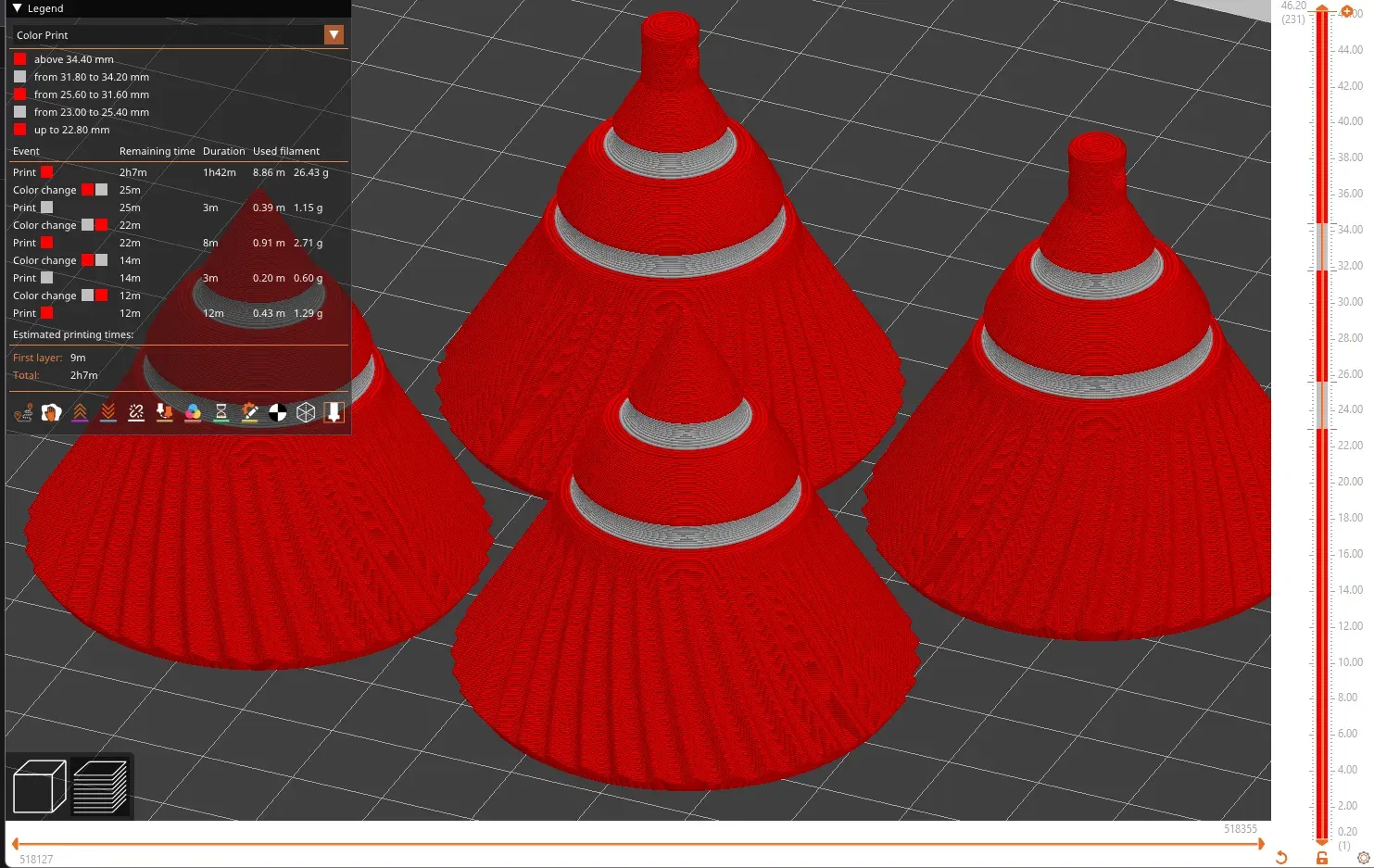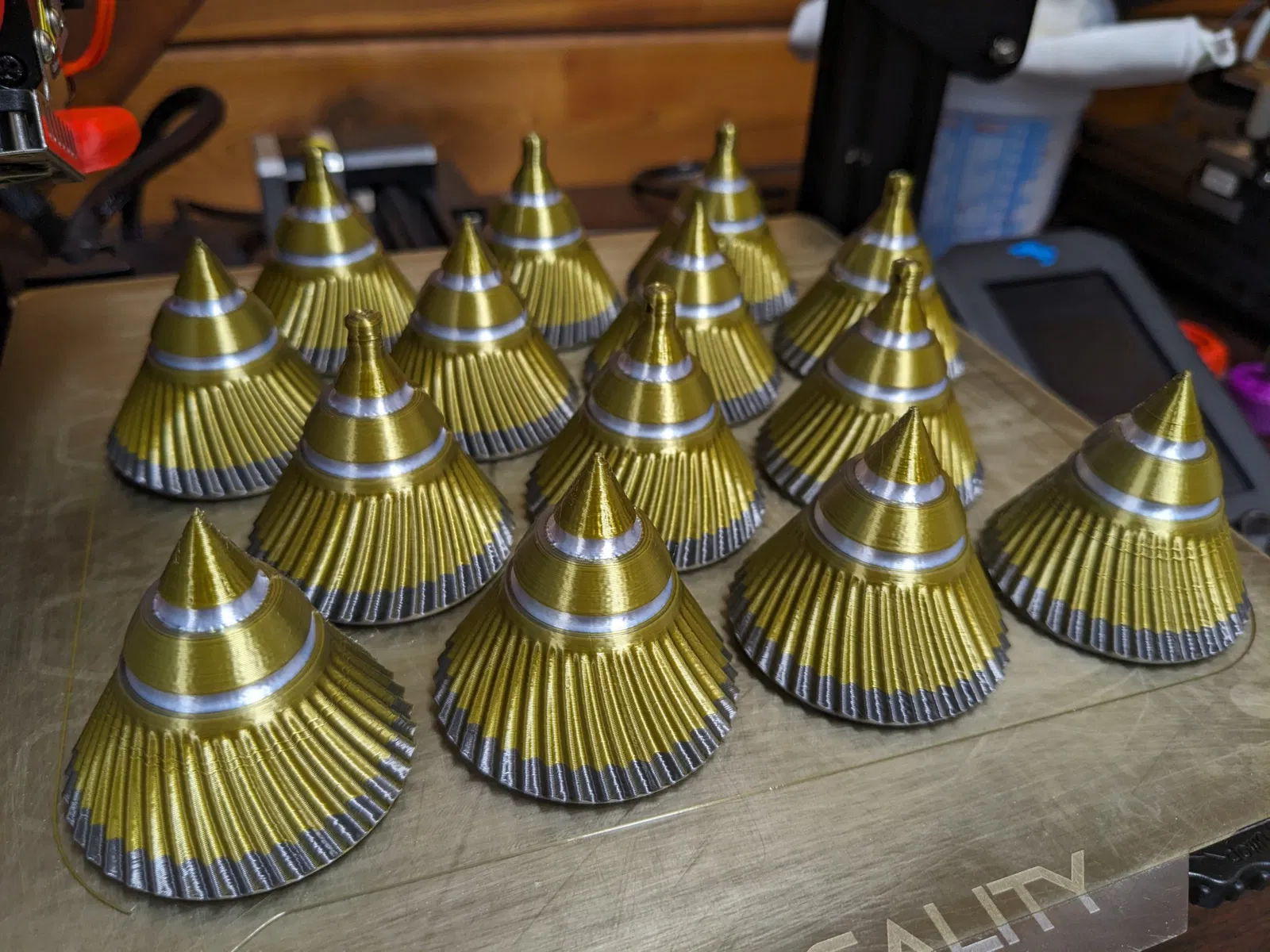 Mình đã in phụ kiện trang trí của mình với 3 lớp vỏ và 0% infill cho tất cả các bộ phận. Đây là sự cân bằng tốt giữa độ bền, sử dụng tối thiểu sợi nhựa và tiết kiệm thời gian in. Mình cũng đã sử dụng tính năng thay đổi sợi nhựa m600 ở các độ cao lớp nhất định để tạo các dải màu ngang. Độ cao thay đổi sợi nhựa mình đã dùng là 23mm / 25.6mm / 31.8mm / 34.4mm.