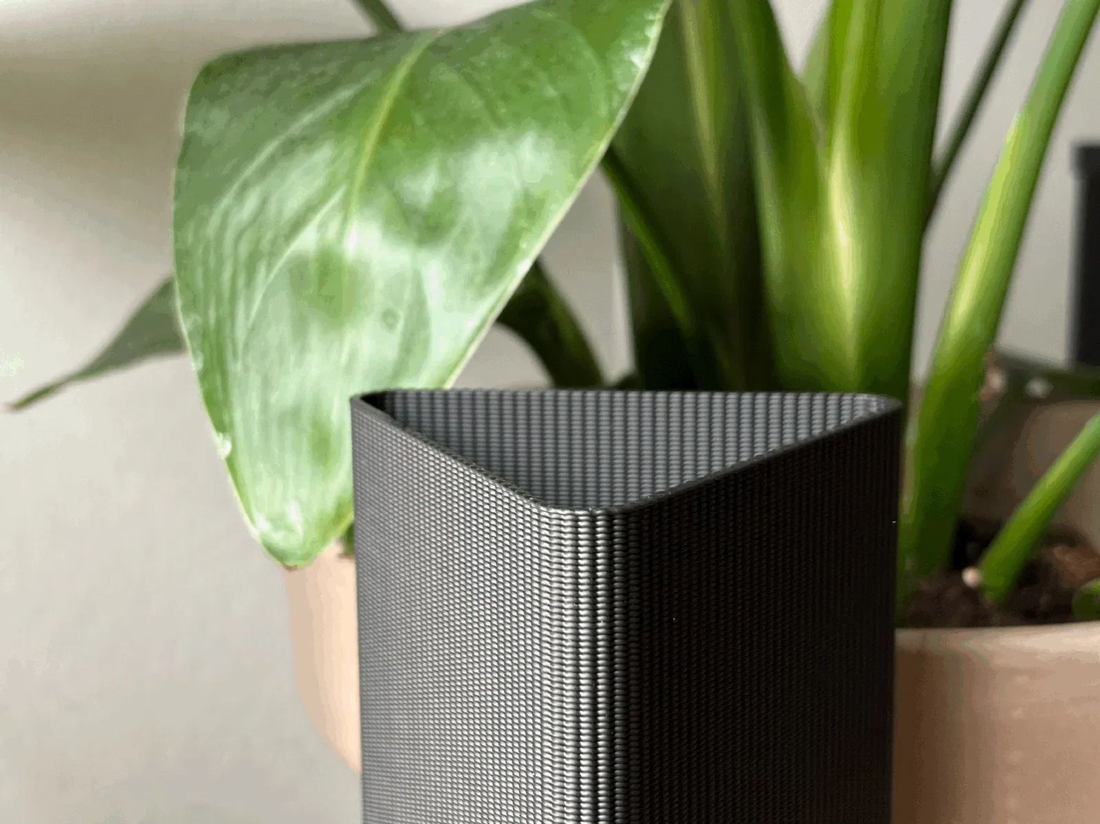 Simple and sleek design of a triangular vase with a wavy structure.