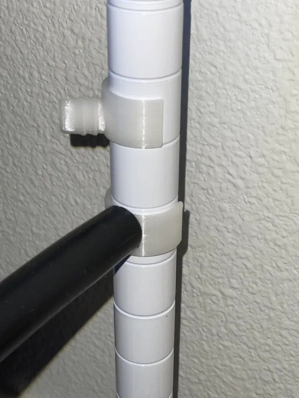 Cái này gắn vô cái ống trụ 1 inch, mấy cái hay có trong mấy cái kệ lưới để đồ thông dụng á. Nó có cái khớp để nối ống tưới 1/2 inch làm thanh ngang.