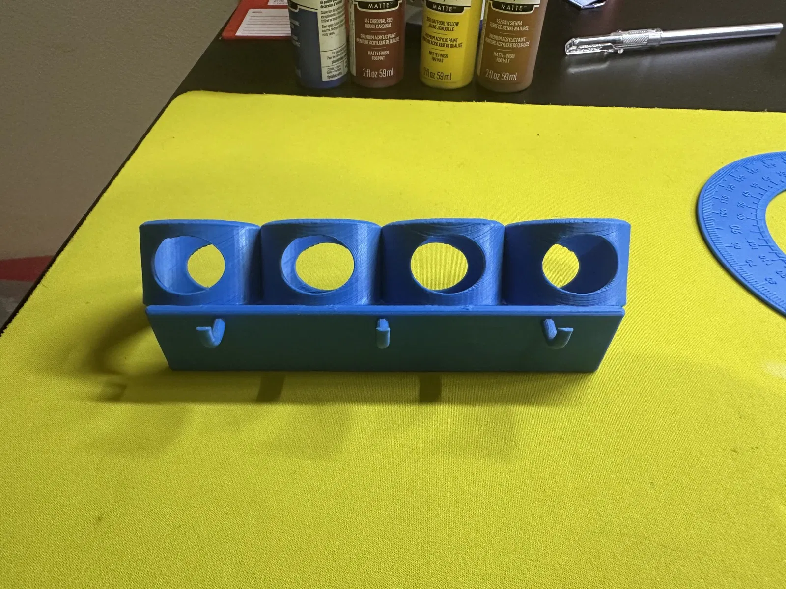 This is a paint bottle holder for hanging on a pegboard. I adjusted a model I found on TinkerCAD to fit the FolkArt and DecoArt bottles I use for my model painting and other painting related crafts. All the other versions of paint holders I found either do not fit the specific bottles I use, or the pegs were too far apart or too large for my pegboard. I hope this helps the next person who wants a pegboard paint holder.