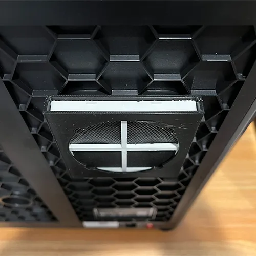Cái đế lọc gió này dùng mấy cái lọc than hoạt tính hay có trong tủ lạnh Kenmore và LG á để lọc không khí thổi ra từ mặt sau của máy in Creality K1. Lắp đặt dễ lắm, chỉ cần xài hai con ốc bắt quạt có sẵn là xong, giúp lọc không khí hiệu quả hơn hẳn.