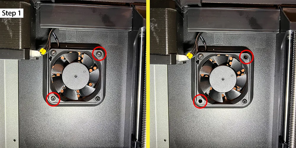 Bước 1: Mở cửa kính máy in ra rồi dùng lục giác tháo hai con ốc của quạt.